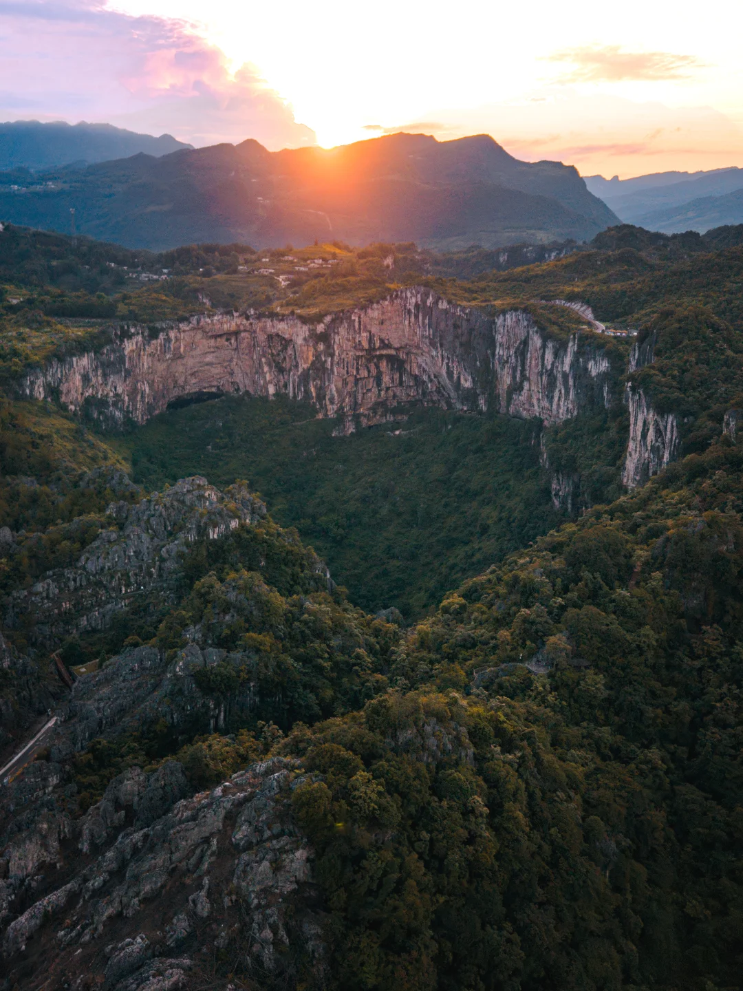 站在天坑下抬头只能望见陡峭险峻的崖壁,升起无人机俯瞰超级壮观。