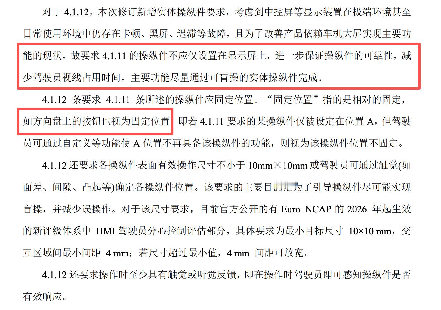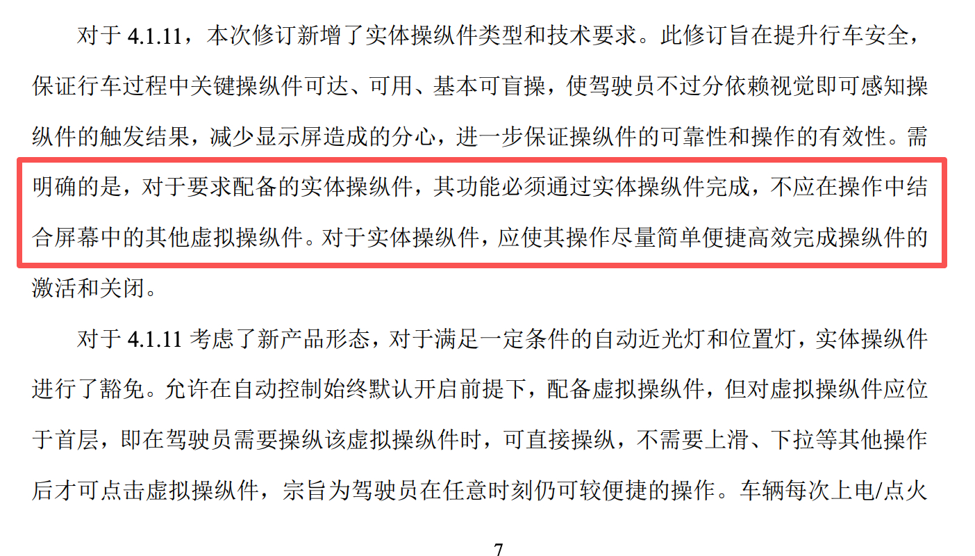 特斯拉在 Model Y 焕新中主动改掉了按键转向,现在屏幕换挡也要成为历史了。意见稿明确说了不可通过屏幕上的虚拟件实现。Model 3 和一些跑车比如法拉利那种按键转向灯,如果可以满足 10*10 mm 的面积,好像还能留下来。