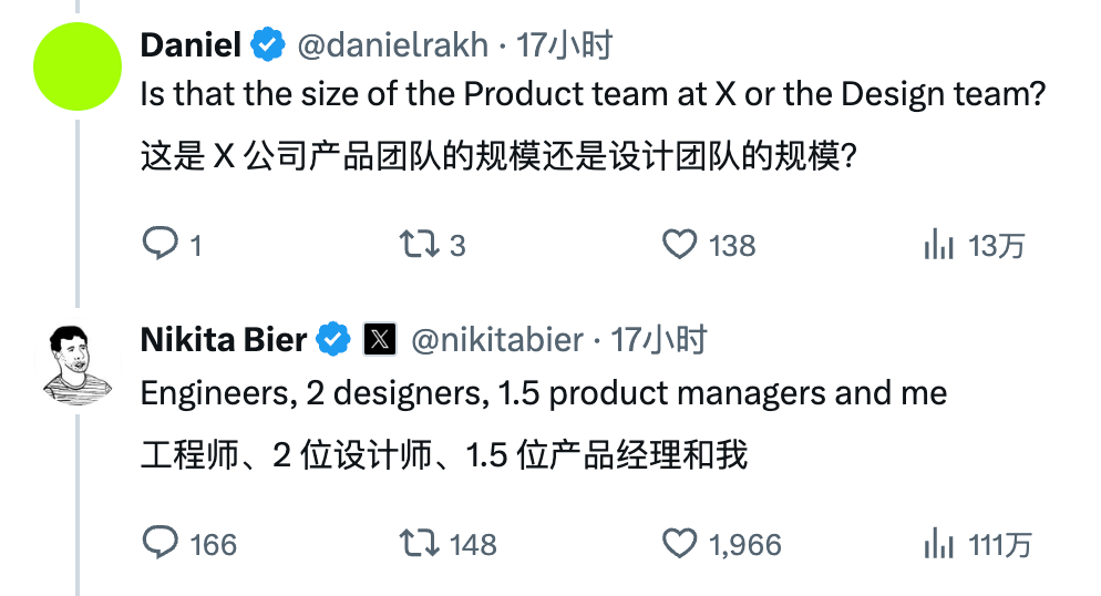 Elon Musk 和 X 产品负责人 Nikita Bier 确认,X 工程团队规模大概 60 人,包括大约 30 位工程师、2 位设计师、1.5 位产品经理(这个 0.5 是怎么算的...)和Nikita Bier 本人。