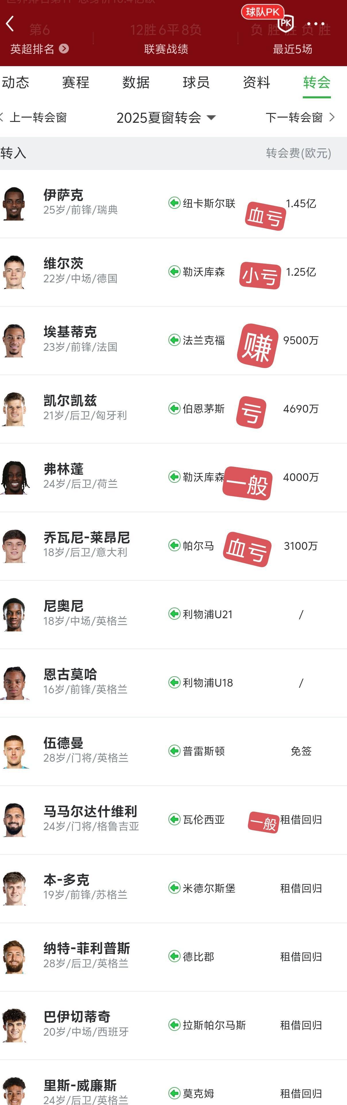 利物浦2025年本来是英超冠军,一个糟糕的夏季转会,把美好全部都毁了。 阿诺德离开,后面替代者动不动受伤。 迪亚斯离队,更是损失最强攻击点。 买来的球员,大多数亏真是失败。 唯一亮点是埃基蒂克还不够稳定。[大金牙]