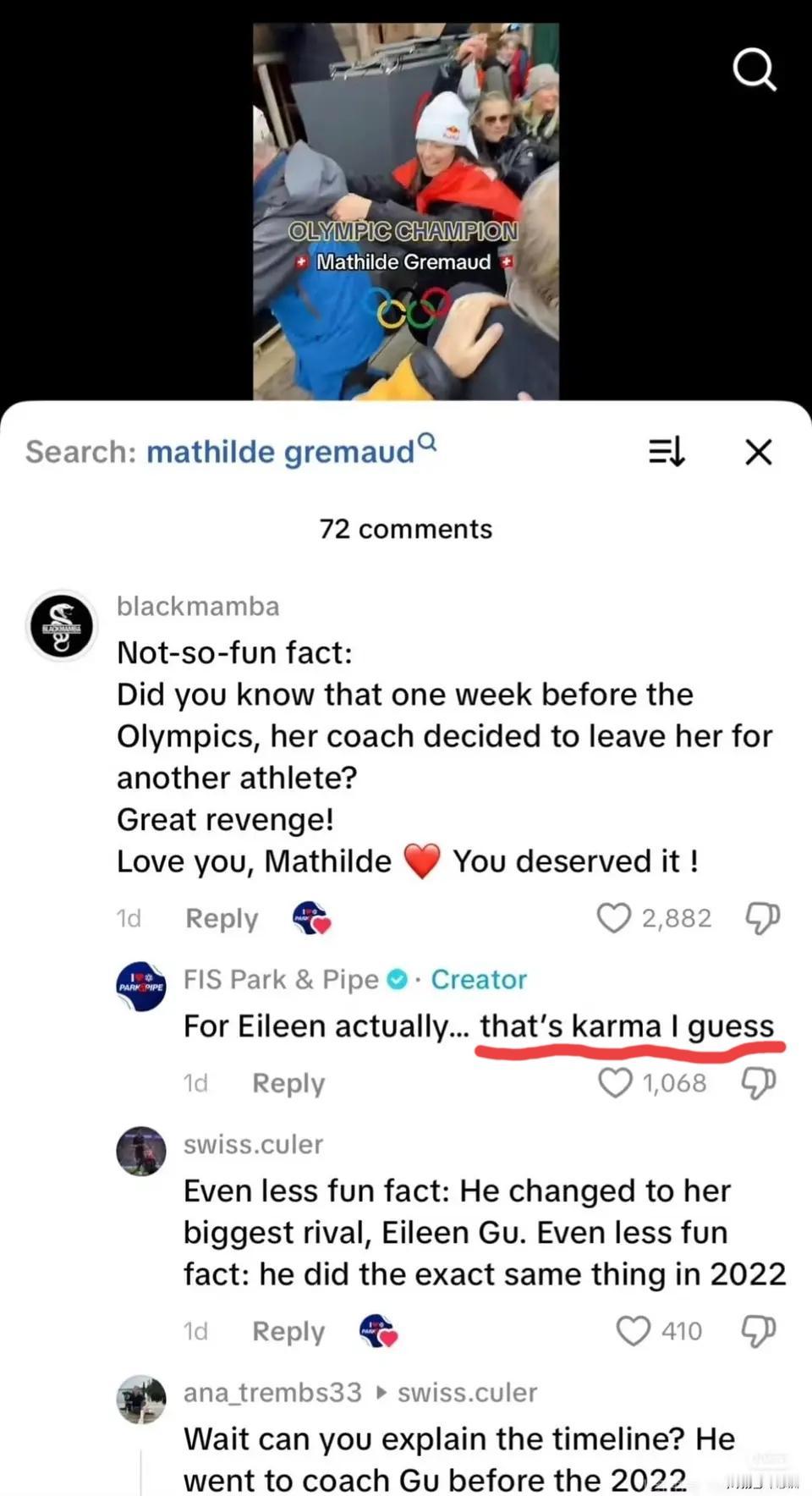 国际雪联,一个国际体育组织,竟然用“这就是报应”这种词攻击谷爱凌,太可恶!被网友们投诉后,还只是通过邮件向谷爱凌道歉,很没诚意。 事情起因于一件小事,谷爱凌在 米兰冬奥会的自由式滑雪女子坡面障碍技巧项目上夺得银牌,而金牌得主是瑞士的名将玛蒂尔德.格雷莫德。二人都是蝉联冠亚军,赛后两人互相道贺,并合影留念。 然而赛后,有个网名“黑曼巴”(blackmamba)的网友在国际雪联的官方账号下留言:“冷知识:你知道吗?在奥运会前一周,她(指玛蒂尔德)的教练决定离开她,去执教另一名运动员。这复仇太解气了!爱你,马蒂尔德,这是你应得的!”观众偏爱某个运动员,说这种带情绪的话,倒也情有可原。意外的是,国际雪联(FIS)账号在这条评论后回复的是“实际上是去了谷爱凌那,我猜这就是报应吧”…… 执教谷爱凌的教练托尼亚宁,曾经是玛蒂尔德的教练,后来带谷爱凌参加北京冬奥会,之后带玛蒂尔德参加世锦赛,去年1月又开始执教谷爱凌。教练的变更,这在体育界也不是什么新鲜事,谷爱凌也特别澄清过,自己没有“抢”教练。但这事成了一些网友攻击谷爱凌的靶子,并以这次比赛玛蒂尔德夺冠,而谷爱凌屈居亚军,称为“复仇”,国际雪联账号的回应更是不顾体面、毫无素质的阴阳怪气,把这说成是报应! 这引来很多看不过去的网友投诉,可是得到的却是一个轻描淡写的邮件回复:“感谢您的留言,并提醒我们注意这件事。您引用的情感色彩评论是不恰当的,不符合国际雪联所期望的中立性和尊重。我们分别删除了。我们将继续通过社交媒体以尊重的方式庆祝我们体育的表演和英雄。再次感谢您的关心,祝您度过美好的一天。”……这种毫无诚意的回应,连道歉都说不上!实在让人愤慨! 难怪谷爱凌说这几年压力很大,除了伤痛,还有各种网暴。 加油,谷爱凌,你是好样的,没夺冠你也是我们的骄傲! 谷爱凌为什么这么优秀,这么飒呢