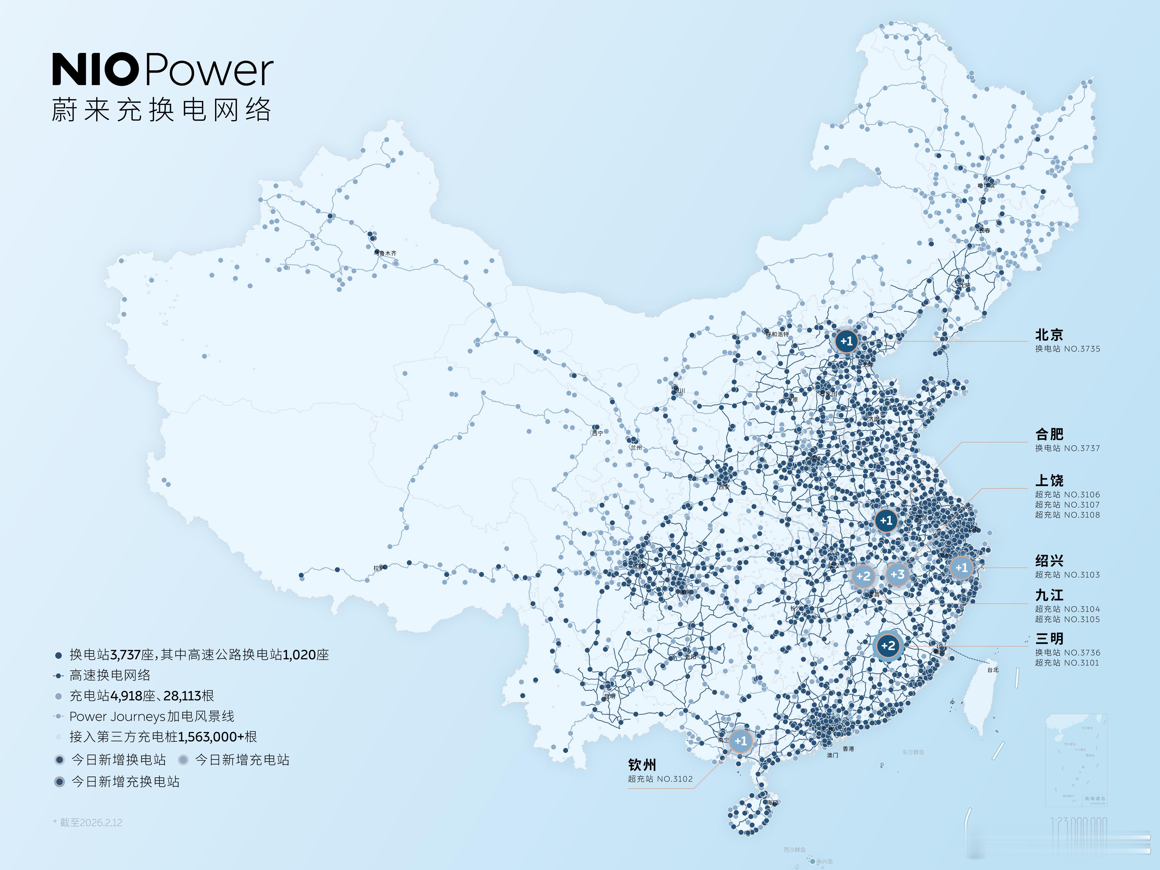 2月12日 NIO Power 11站上线NO.3735 蔚来换电站 | 北京苹果园NO.3736 蔚来换电站 | 三明清流大酒店NO.3737 蔚来换电站 | 合肥燃气大厦NO.3101 蔚来超充站 | 三明清流大酒店 NO.3102 蔚来超充站 | 钦州灵山六峰湖 NO.3103 蔚来超充站 | G1522常台高速新昌服务区台州方向NO.3104 蔚来超充站 | G70福银高速庐山服务区银川方向NO.3105 蔚来超充站 | G70福银高速庐山服务区福州方向NO.3106 蔚来超充站 | G56杭瑞高速鄱阳服务区瑞丽方向 NO.3107 蔚来超充站 | G56杭瑞高速鄱阳服务区杭州方向 NO.3108 蔚来超充站 | G56杭瑞高速婺源北服务区瑞丽方向持续布局-让加电比加油更方便