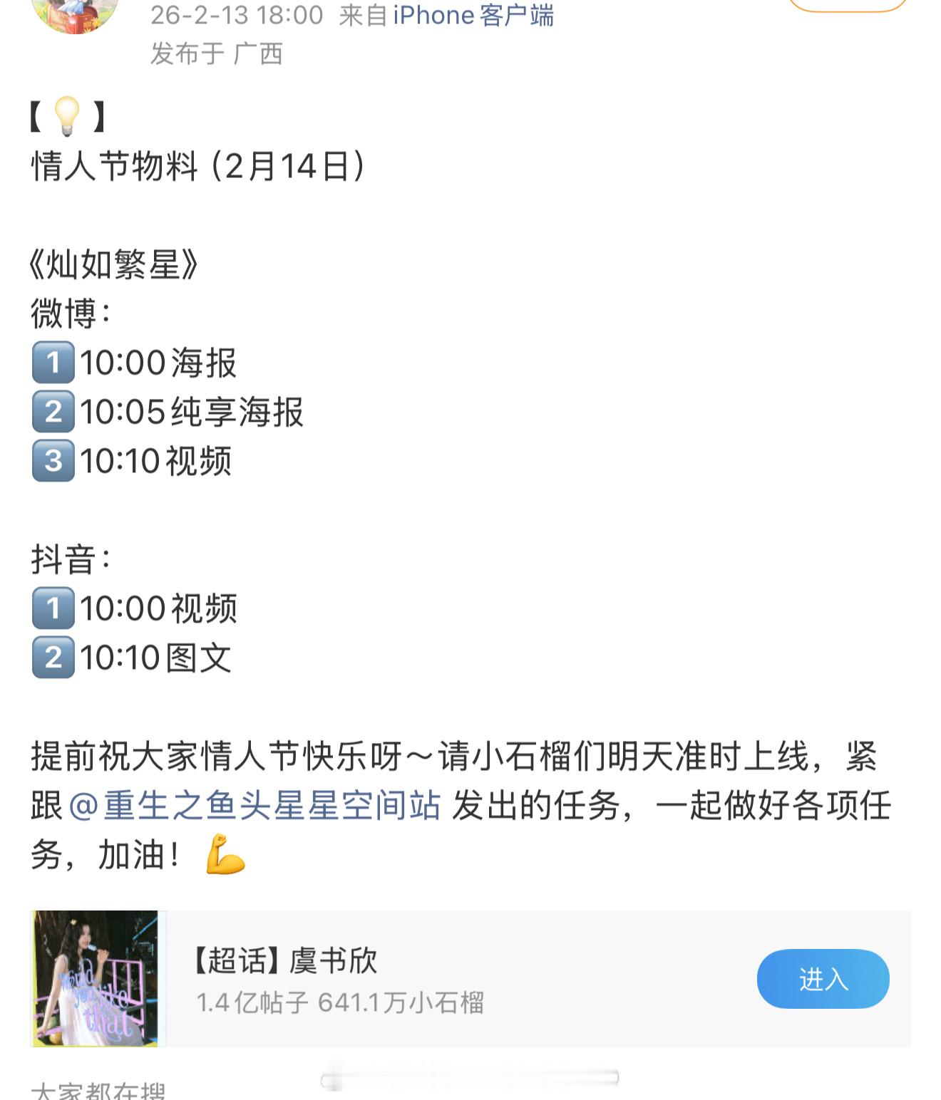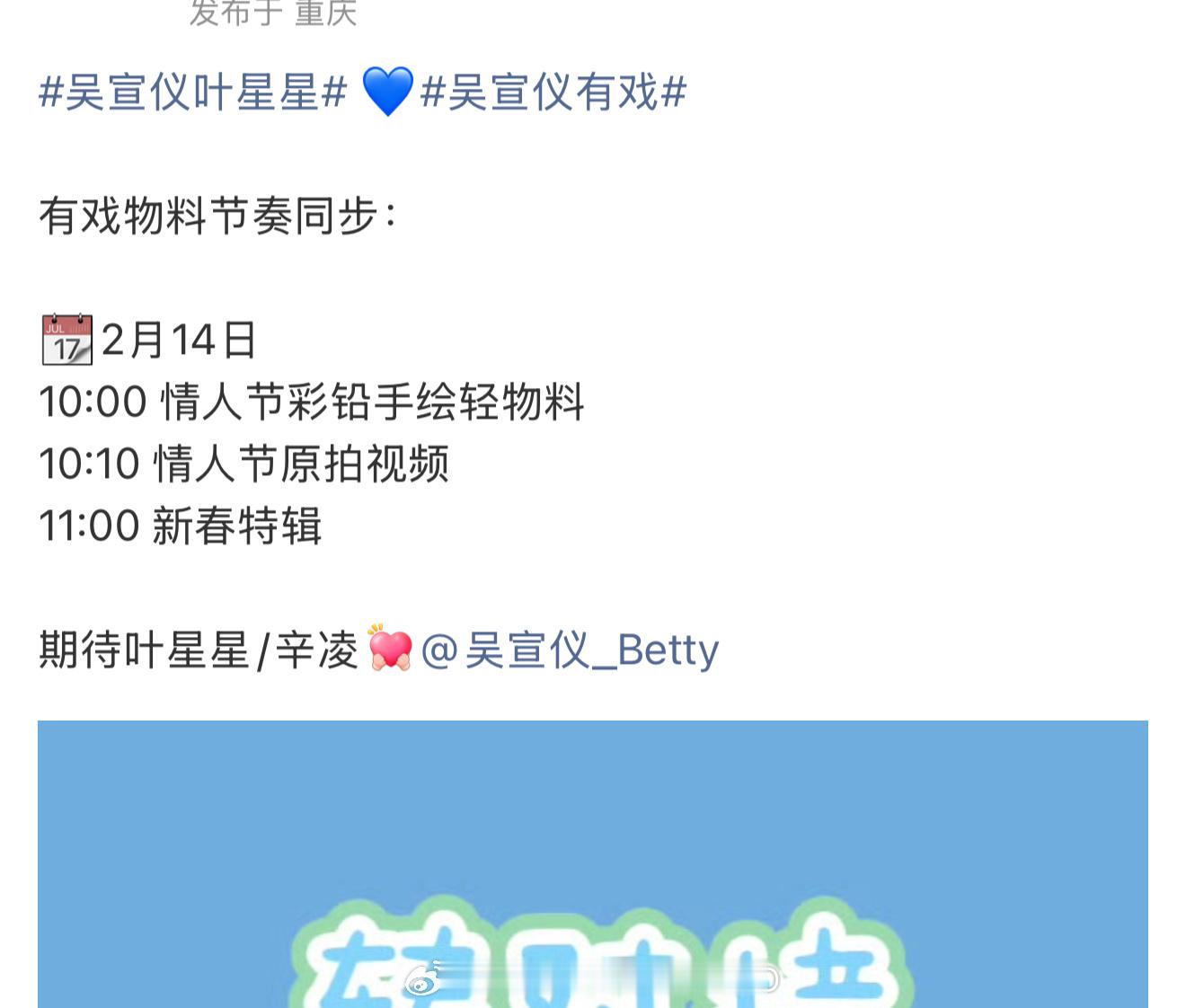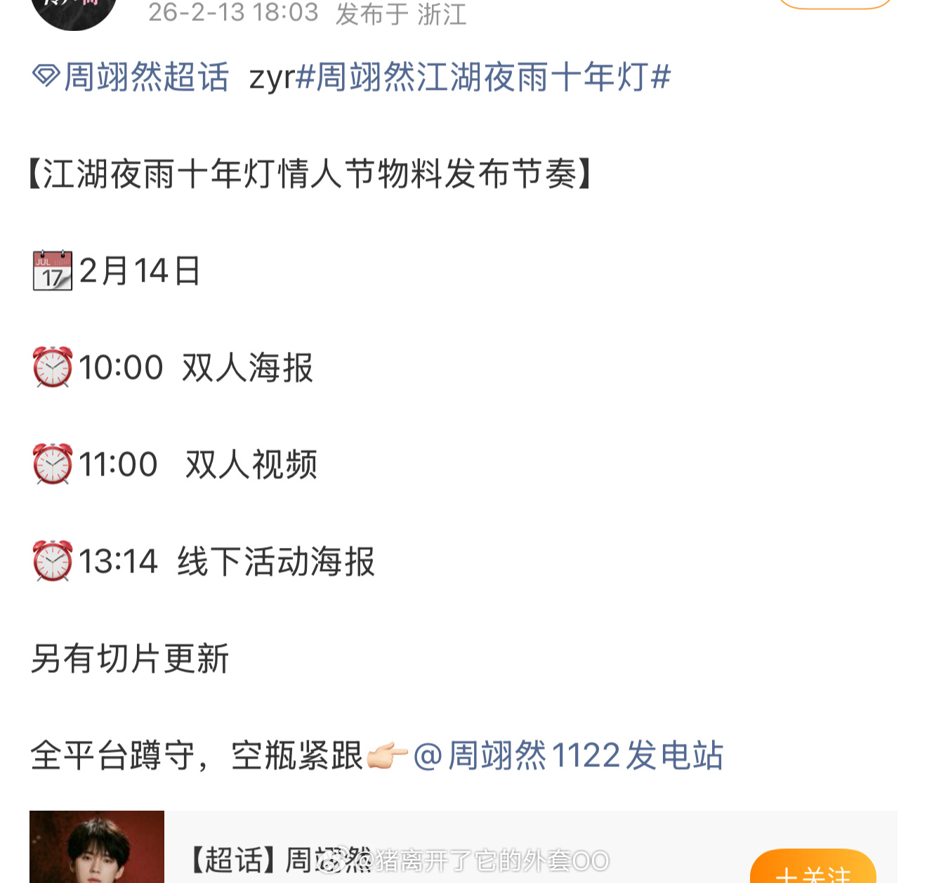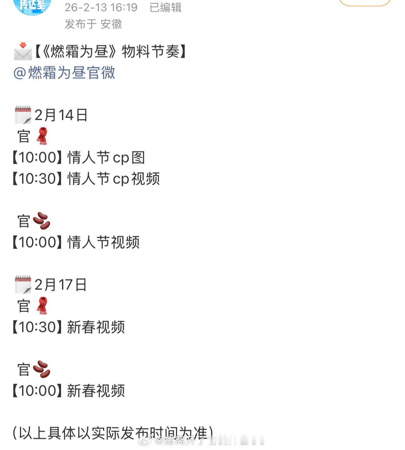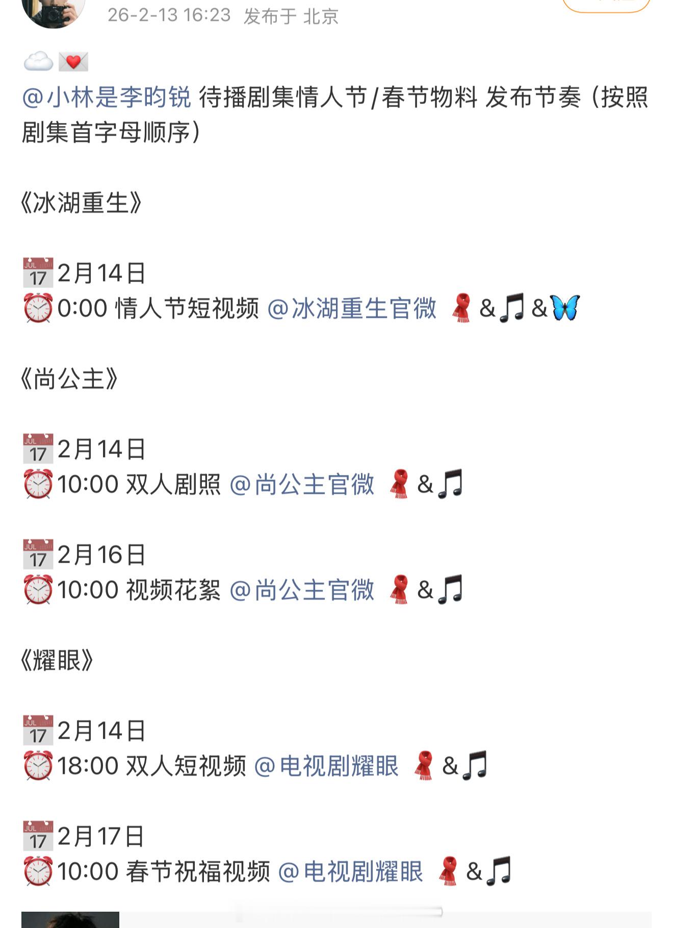 有情人节物料的剧第三弹:虞书欣、陈靖可《灿如繁星》刘昊然、李兰迪《海岛舒服日志》檀健次、卢昱晓《何不同舟渡》张凌赫、王楚然《这一秒过火》李昀锐、黄杨钿甜《冰湖重生》关晓彤、李昀锐《耀眼》林一、卢昱晓《折月亮》周翊然、包上恩《江湖夜雨十年灯》王玉雯、田嘉瑞《燃霜为昼》吴宣仪、翟潇闻《有戏》包上恩、周柯宇《炽夏》张康乐、周洁琼《四十七》