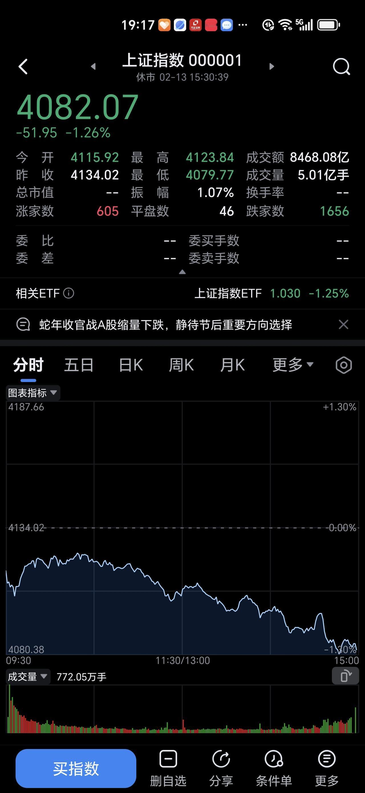 今天大盘跌得有点吓人,几乎在最低点收盘,完全出乎意料之外。中午收盘时,我还坚信下午收盘应该在4100点上方。谁知道,下午会走成那样! 截止下午收盘,上证指数跌52点,跌幅1.26%.我的资产跌幅为0.66%,还能接受。其实,不能接受又能怎样呢?少赔当赚吧! 暂时忘掉赔钱的不开心,马年春节后继续博弈。
