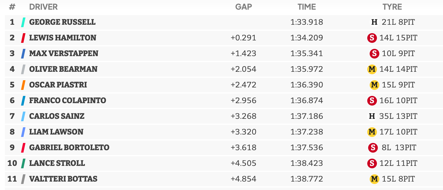 里程方面,劳森完成84圈,拉塞尔78圈,皮亚斯特里73圈
