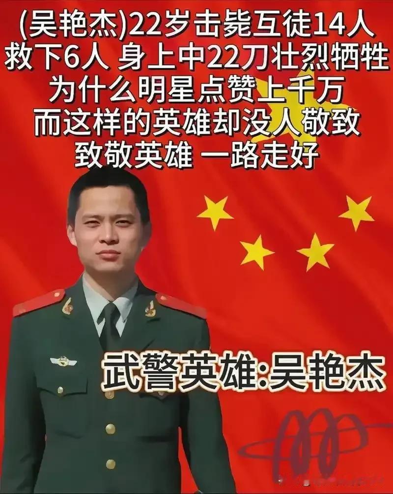 吴艳杰,22岁击毙歹徒14个,救下6人,身上中22刀壮烈牺牲。为什么明星点赞上千万,而这样的英雄却没人致敬? 吴艳杰是河南周口扶沟的普通农家孩子,1989年冬天出生,2009年冬天穿上军装走进武警新疆总队的军营。 他不是生来就带着英雄的光环,高中时的他开朗爱笑,同学遇到困难总会伸手帮忙,是老师眼里踏实靠谱的好学生,是家人心里懂事孝顺的小伙子。 22岁,本该是人生最鲜活的年纪,他却把生命永远定格在反恐一线。 那场惊心动魄的战斗里,面对持刀疯狂反扑的暴徒,他没有半分退缩。 每一刀都刺在血肉之躯,每一步都踏在生死边缘,他用身体护住无辜群众。 身中22刀,是常人难以想象的剧痛,更是一名战士用生命践行誓言。 他拼尽最后力气,成功解救6名被困群众,和战友一同制服14名暴徒。 当硝烟散去,这个刚入伍不到两年的年轻士兵,再也没能睁开眼睛。 他来自中原大地最普通的农家,没有显赫背景,没有流量加持。 参军前,他是会帮父母干农活、惦记家人冷暖的平凡少年。 穿上军装,他就扛起了守护边疆、保卫人民的千钧重担。 如今网络世界里,一条明星动态动辄收获千万点赞、海量转发。 有人为娱乐新闻彻夜热议,却很少有人主动去了解一位烈士的故事。 流量聚光灯下,真正用生命守护我们的人,常常被轻易忽略。 吴艳杰牺牲后,被追认为烈士、中共党员,追记一等功。 家乡父老自发走上街头,迎接魂归故里的英雄,哭声与敬意交织。 当地政府与部队始终铭记他的功绩,常年慰问关怀他的家人。 真正的岁月静好,从来不是凭空而来。 是无数像吴艳杰一样的年轻人,在我们看不见的地方负重前行。 他们用青春、热血甚至生命,换来了社会安宁与万家灯火。 我们可以喜欢明星,追求娱乐,但不该忘记守护安宁的脊梁。 流量会过时,话题会冷却,唯有英雄的精神永远值得铭记与传承。 遗忘英雄,才是一个时代最可怕的悲哀。 他不是教科书里冰冷的名字,是有父母、有牵挂、有温度的年轻人。 他本可以拥有漫长人生,却选择把危险挡在自己身前。 这样的人,值得每一个中国人发自内心的敬意与缅怀。 各位读者你们怎么看?欢迎在评论区讨论。