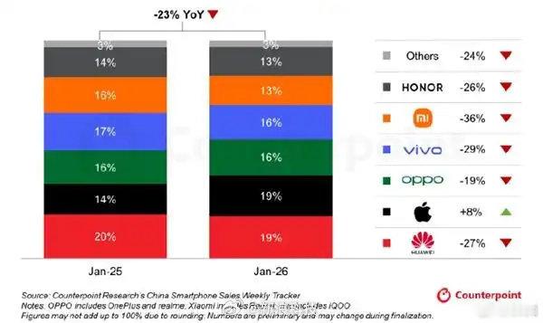 华为获1月中国手机销量第一实质是整个手机市场销量除了苹果都在下滑
