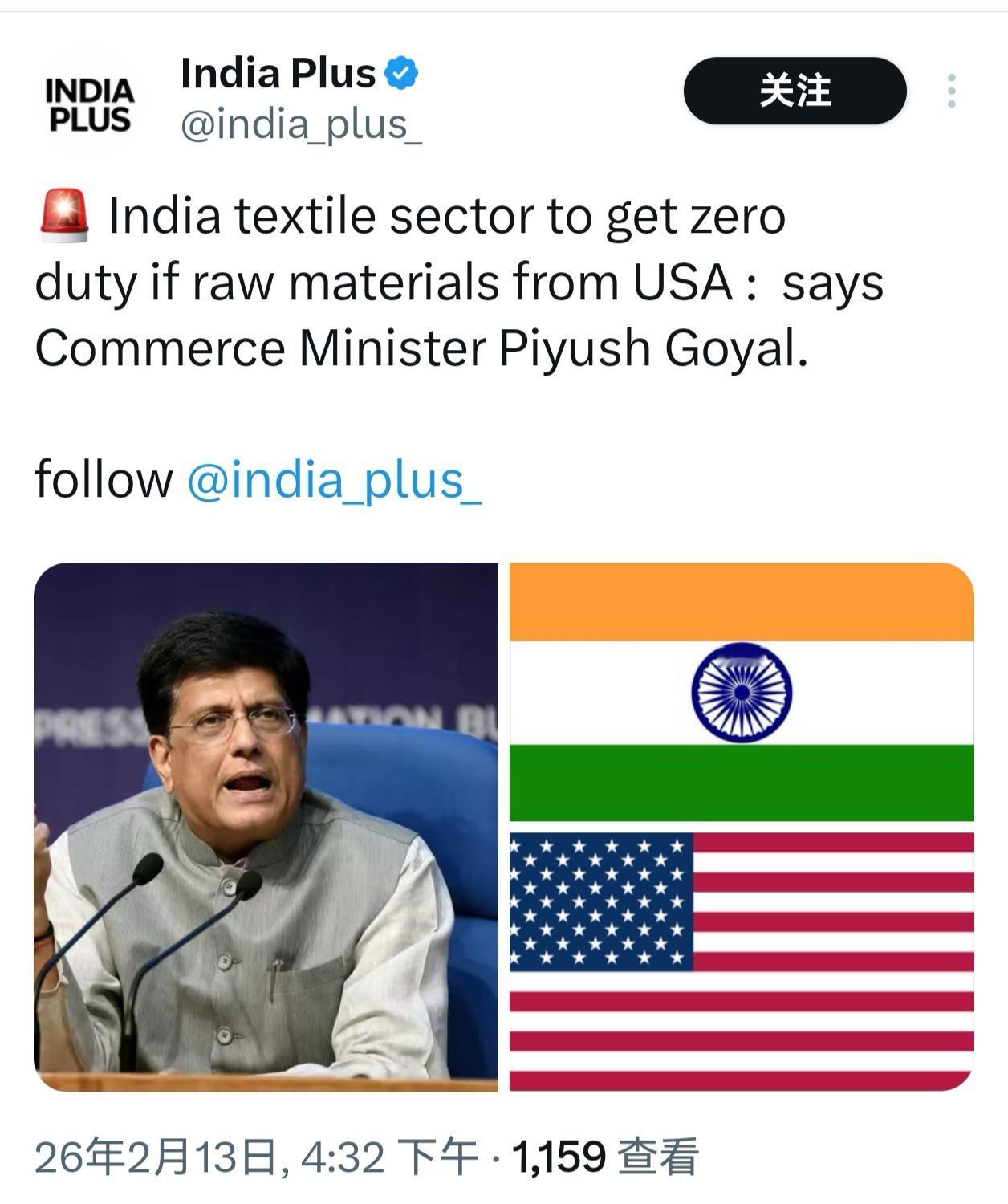 印度棉农有福了,原因是其有一个不懂印度棉农利益的商务部长。 在孟加拉国和美国达成最新的贸易协议之后,印度商务部长皮尤什·戈亚尔站出来表示,印度纺织行业如果使用来自美国的原材料,也将像孟加拉国一样享受零关税待遇。 但他不知道的是,由于孟加拉国棉花供给严重不足,其高度依赖进口,是全球最大棉花进口国之一。主要进口来源包括巴西、印度、和美国等。 如果孟加拉国棉花订单都给了美国,不仅享受零关税,还会对印度棉花出口造成影响,戈亚尔还要学孟加拉国一样进口美国棉花,这下印度棉花这下真不知道该往哪儿卖了,卖给孟加拉?人家有美国零关税的了。卖给自家纺织厂?戈亚尔说了,咱们也用美国的,印度棉农有这样的商务部长,好好享受吧!