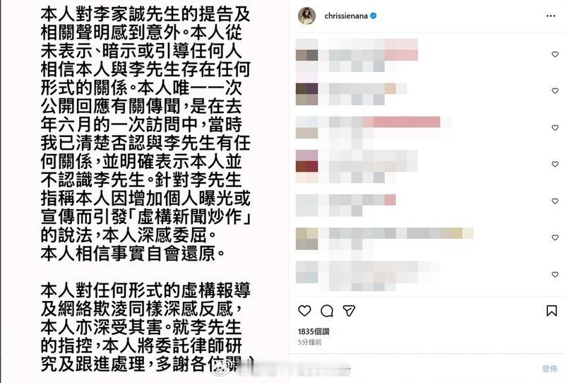 本人对李家诚先生的提告及相关声明感到意外。本人从未表示、暗示或引导任何人相信本人与李先生存在任何形式的关系。本人唯一一次公开回应有关传闻,是在去年六月的一次访问中,当时我已清楚否认与李先生有任何关系,并明确表示本人并不认识李先生。针对李先生指称本人因增加个人曝光或宣传而引发“虚构新闻炒作”的说法,本人深感委屈 。本人相信事实自会还原。