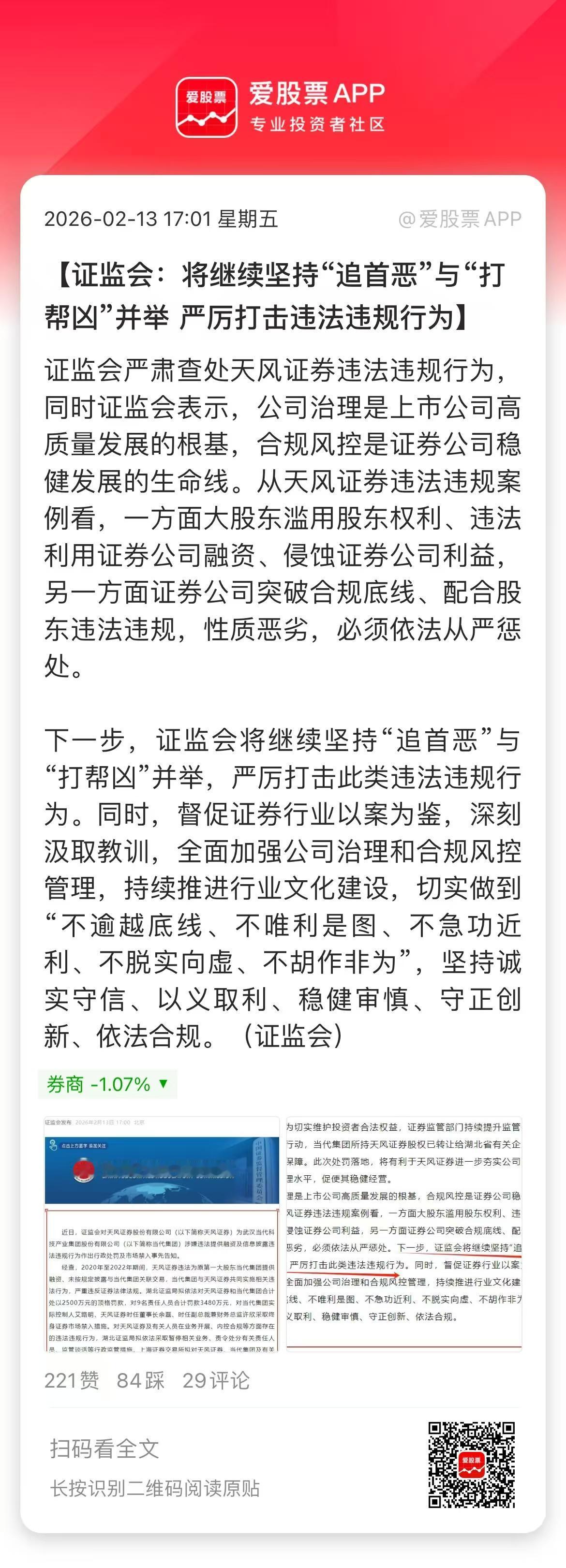 盘后村里又重拳出击了,打击市场各种违法犯罪! 1、天风证券因信披违规涉嫌违法,收到证监会立案告知书,并2500万元顶格罚款。 2、正元智慧:实控人陈坚犯操纵证券市场罪 被判处有期徒刑三年。 3、创识科技:控股股东、实控人张更生犯单位行贿罪 被判处有期徒刑二年。 4、嘉麟杰:实控人李兆廷被公安局执行拘留。 5、在互动平台“自问自答” 英集芯被证监会立案调查。 总之,罚款的罚款,拘留的拘留,抓人的抓人,立案调查的立案调查。最奇葩的是英集芯在互动平台“自问自答” ,这个都能被村里揪出来,真挺逗的! 爱股君去看了下,该公司主要吹自己涉足脑机接口领域,还说自己芯片已经量产出货。A股确实喜欢炒这些蹭概念的,这一年股价涨得还挺猛的。