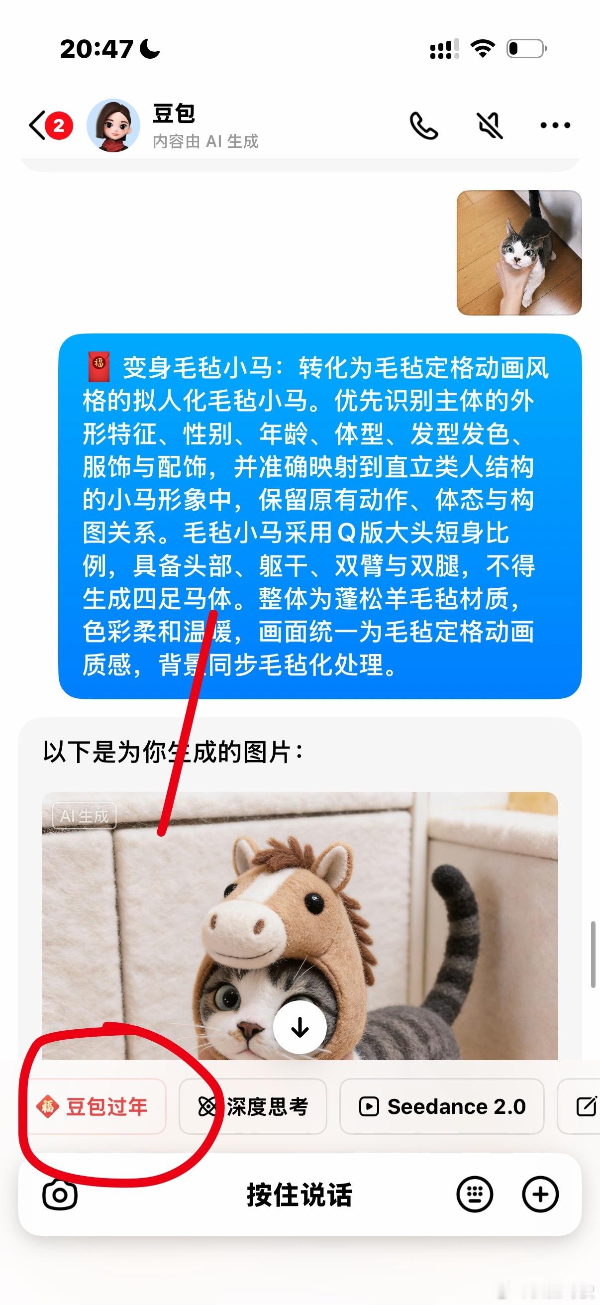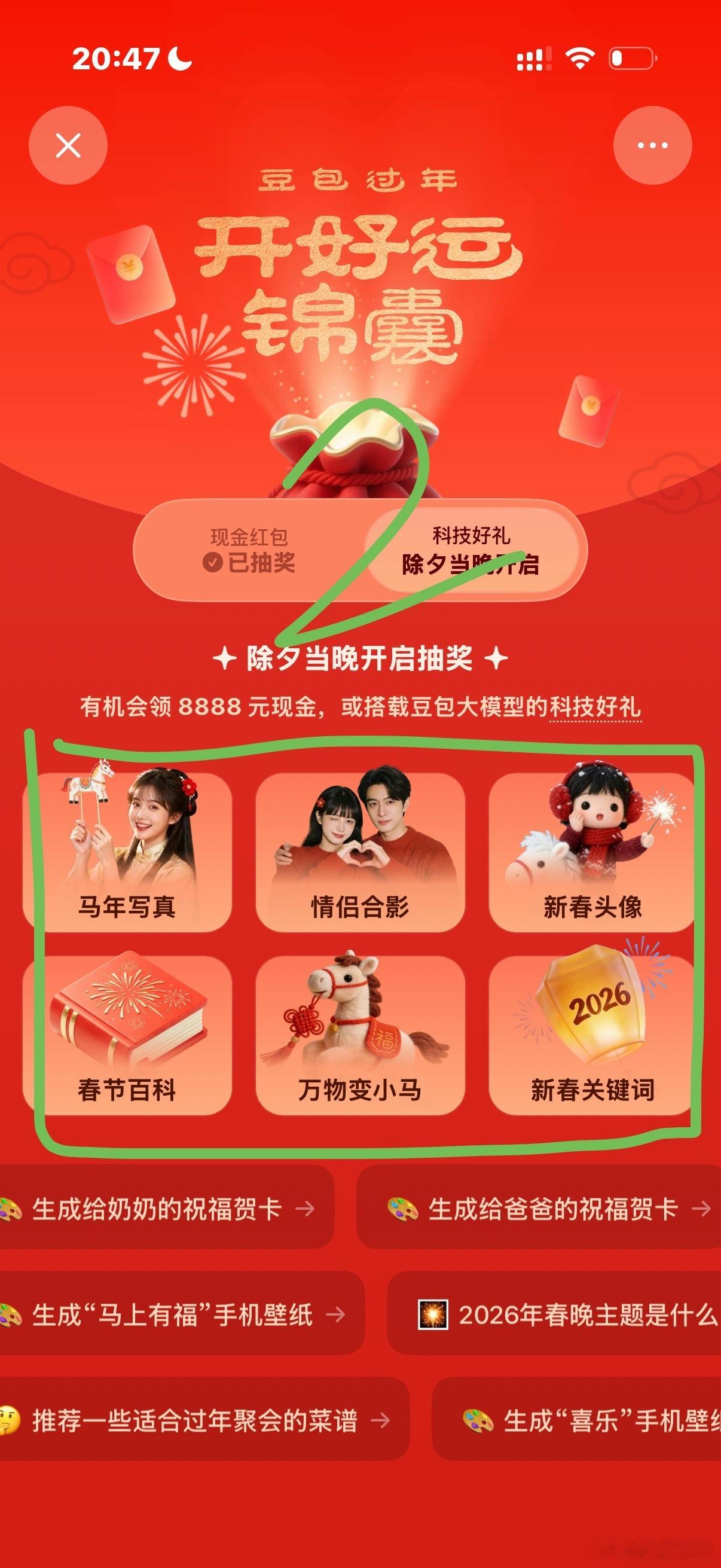 豆包红包提现1.66第一步:打开豆包点击豆包过年第二步:选择一个AI任务第三步