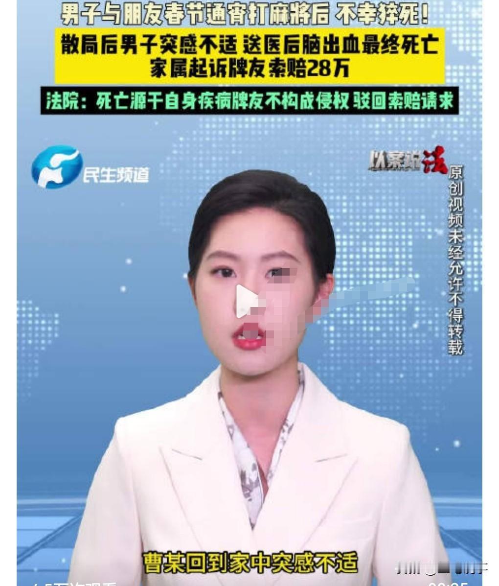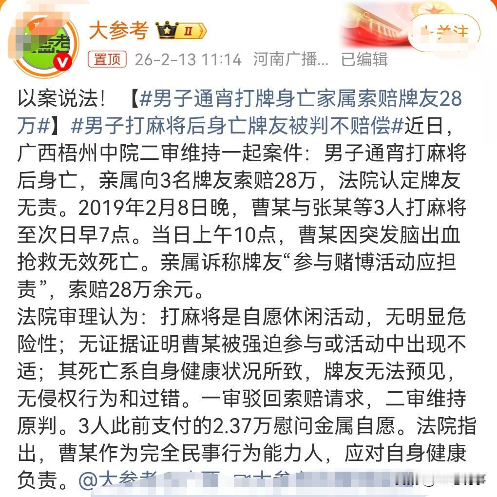 身体差的就不要熬夜打牌了,有可能猝死。 2月13日热搜。男子通宵打牌身亡,家属索赔牌友28万。 家属是肯定会索赔的,但是法律不一定支持。 最终也没有支持,因为男子是自愿打牌的,牌友也无法预见他会这样。 脑出血,给人的感觉是有高血压。 高血压就别打牌了,这可是大忌。