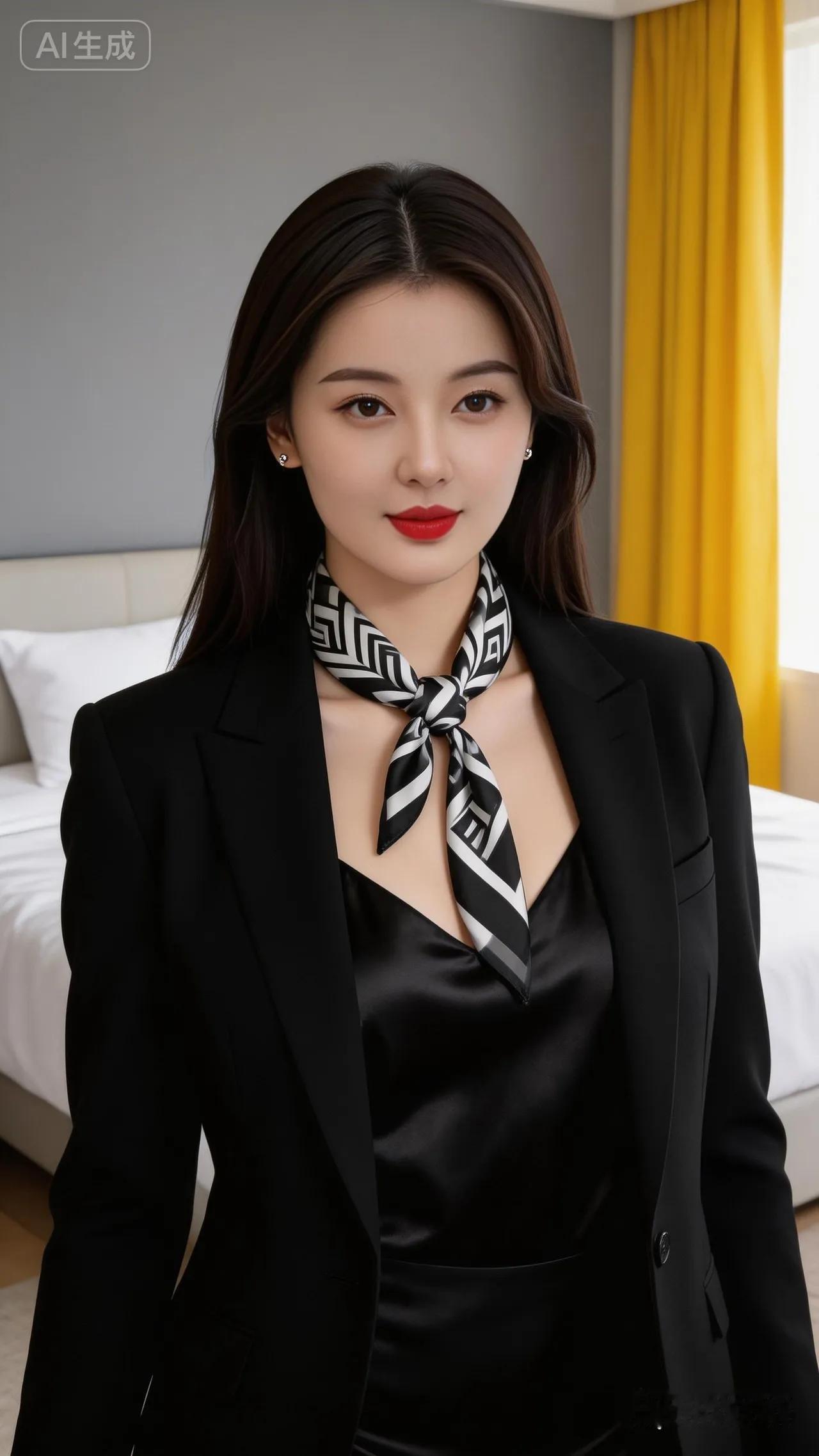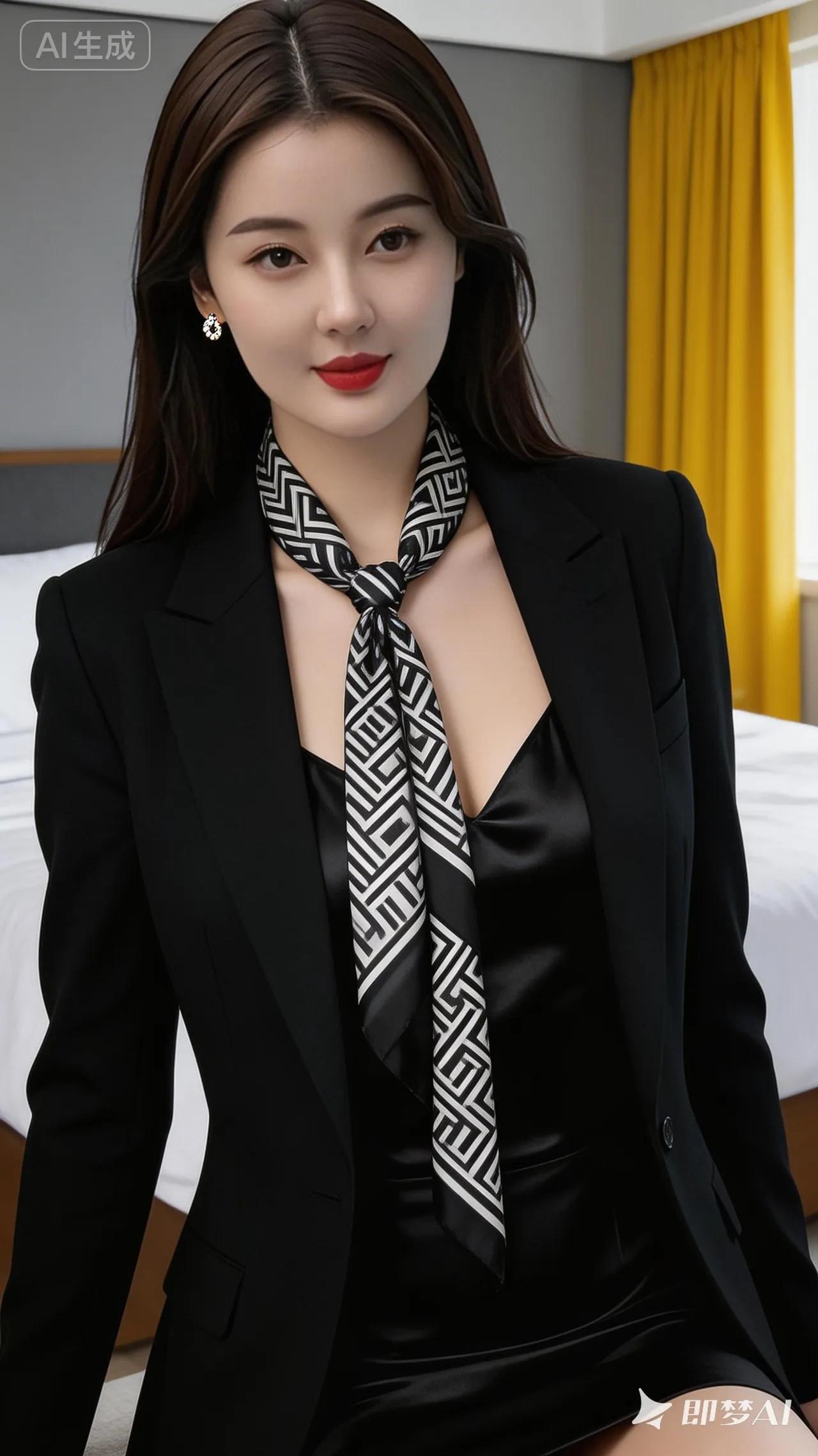 优雅职场风,黑西装套装搭配几何领巾,尽显时尚魅力!💄✨