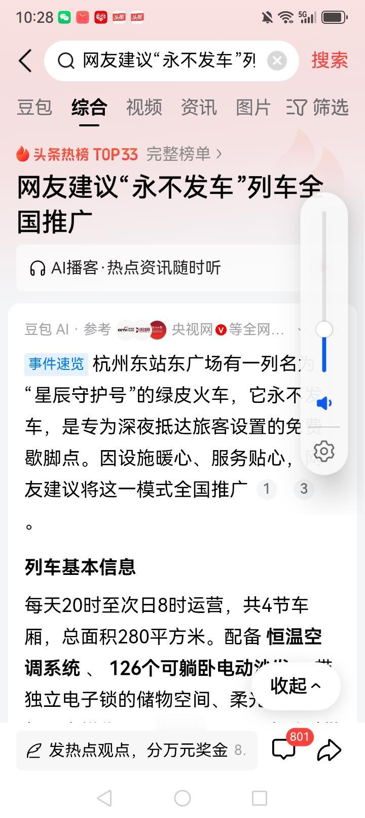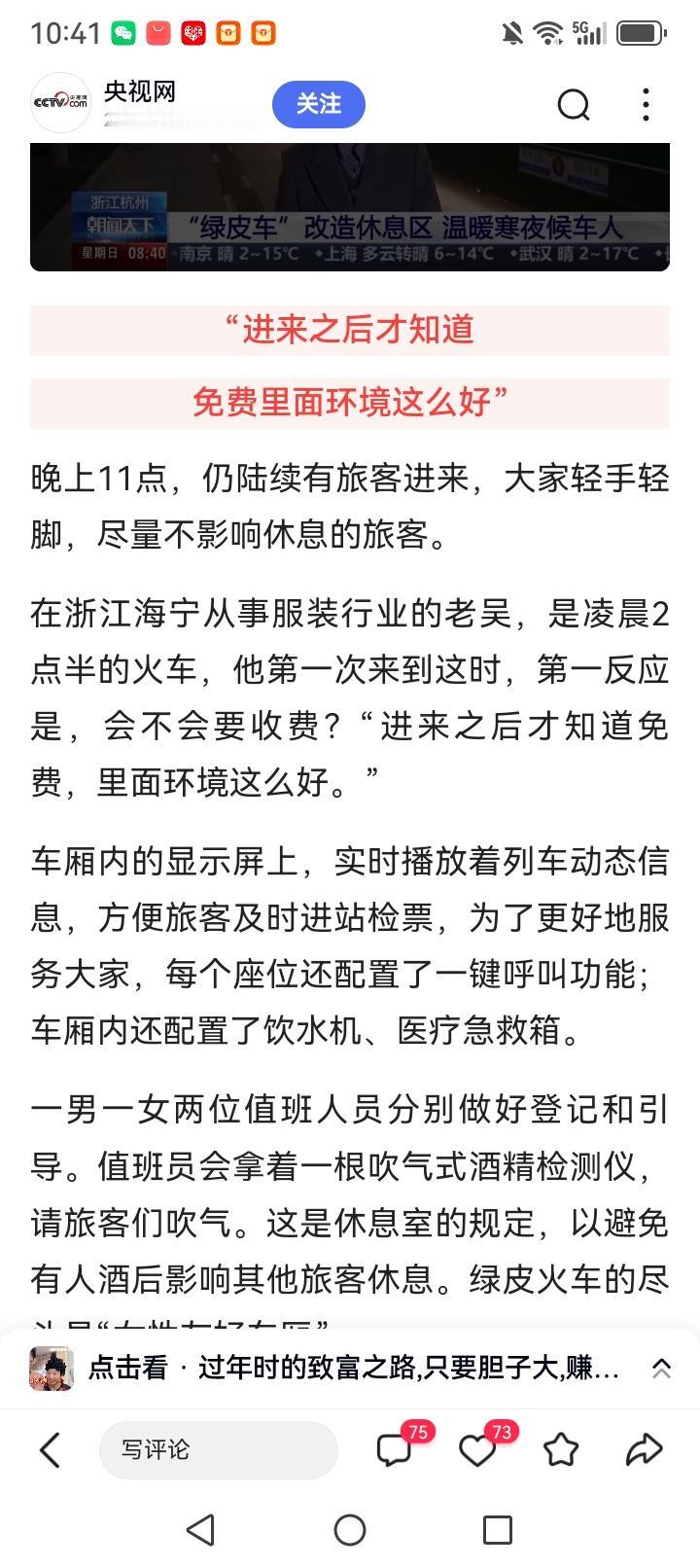 一列永不开动的绿皮车 温暖无数寒夜等车人! 近日在春运高峰期从杭州东站传来了一组珍贵的照片。 第一张照片,是一列老式绿皮火车,它原本承载着20年前无数人归家和外出求学求生的记忆。 而今这列车停靠在杭州火车站入站口处,永远不会启航。 第二张照片,是几十人站在这列只有4节车厢的绿皮车前等候上车。而等车的时间段都是在深夜23点至第2天凌晨。 第三张照片, 是这列火车车厢里乘客们舒适休息的场景一一软式躺椅沙发上,有人在刷手机,更多的人早已安然入睡。 第四张照片,夜已深沉,列车上的乘客已“躺”满,且全部沉沉睡去。 看了四张照片,您可能还很懵懂,包括我也是在深入探究后,才了解了杭州东站温暖而贴心的高配服务。 这列火车是基于杭州东站工作人员发现在最后一列火车开出站后,还有许多旅客留置在车站广场,等着转下一趟车。还有许多早上要乘车的旅客会提前来到车站候车。 而漫漫长夜会让这等待很煎熬。于是车站服务人员提出建议,创建一座凌晨攻乘客休息的空间。 经过反复斟酌,最后敲定在山东临沂专门定制了这款让人充满怀念充满美好记忆的绿皮列车。 这辆永远不会开动的绿皮火车就这样暖心的诞生了。只要你拥有一张夜半到凌晨的火车票并需要候车时,便可以得到一张休息卡。 进入这列绿皮车休息室的乘客们,无不怀着感恩的心情,夸赞着杭州东站的贴心服务。 网友们更是一致请求更多火车站效仿学习。 又是杭州这个充满活力的一线城市,总是在合适的时机给咱们一份惊喜。 愿这份暖扩散开来,漫布到全国各大有需要的火车站。