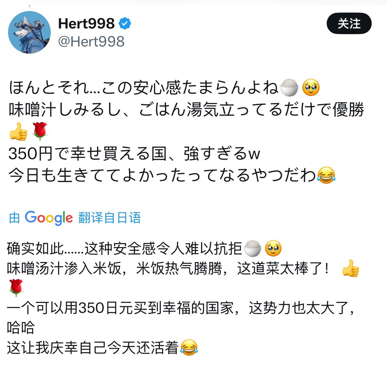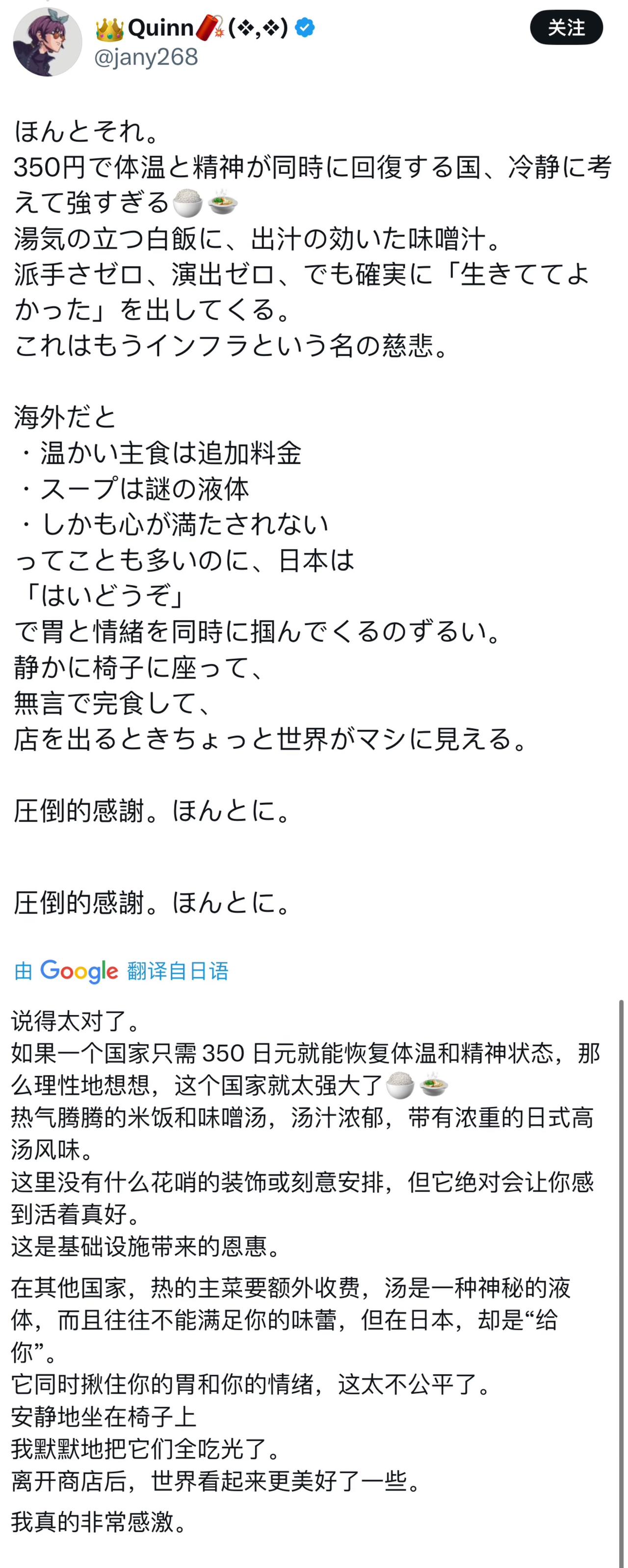 就这都得写篇小作文,感觉真可怜… 近日,看到一个日本网民发帖说,感谢国家能够让他只花350日元(约16)就能吃上热腾腾的米饭和味噌汤,真是个幸福的国家… 虽然看着有点寒酸… 但要是饿了很久,经常吃不饱,可能还真的得感恩一下这碗饭了…