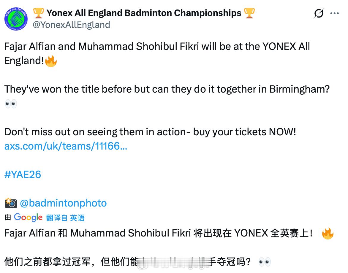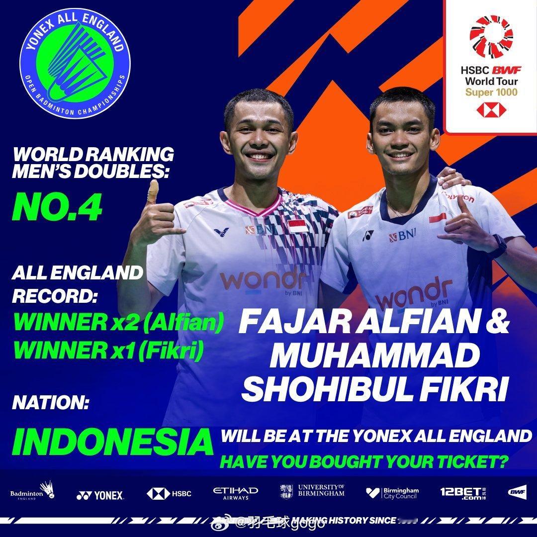 全英官方:曾经各自与不同搭档在全英夺冠的阿尔菲安/菲克里,会携手在2026年的赛事夺冠吗?