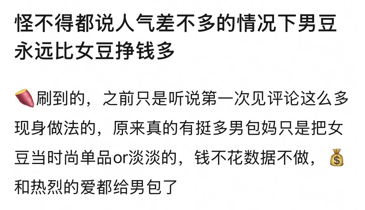 怪不得都说人气差不多的情况下男豆永远比女豆挣钱多…