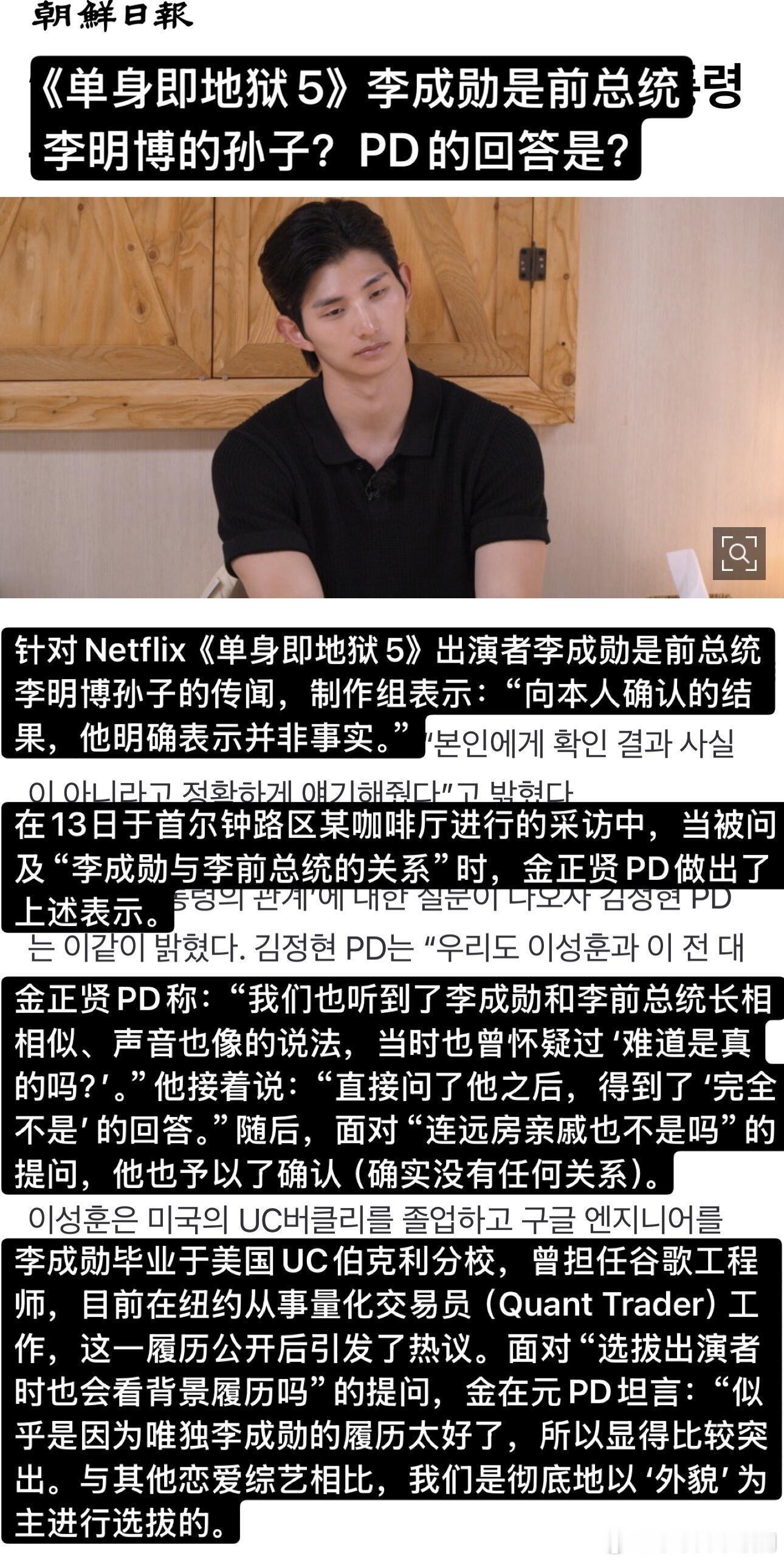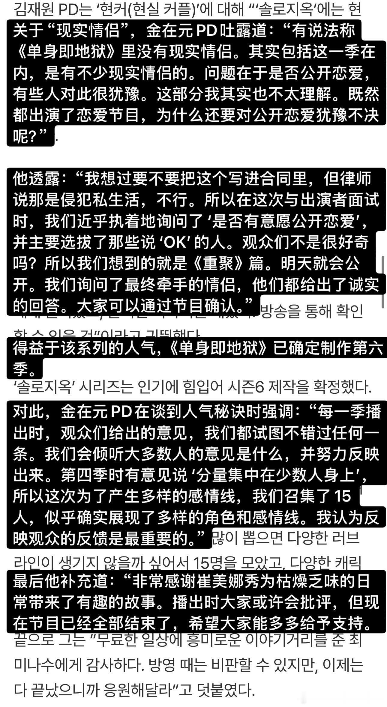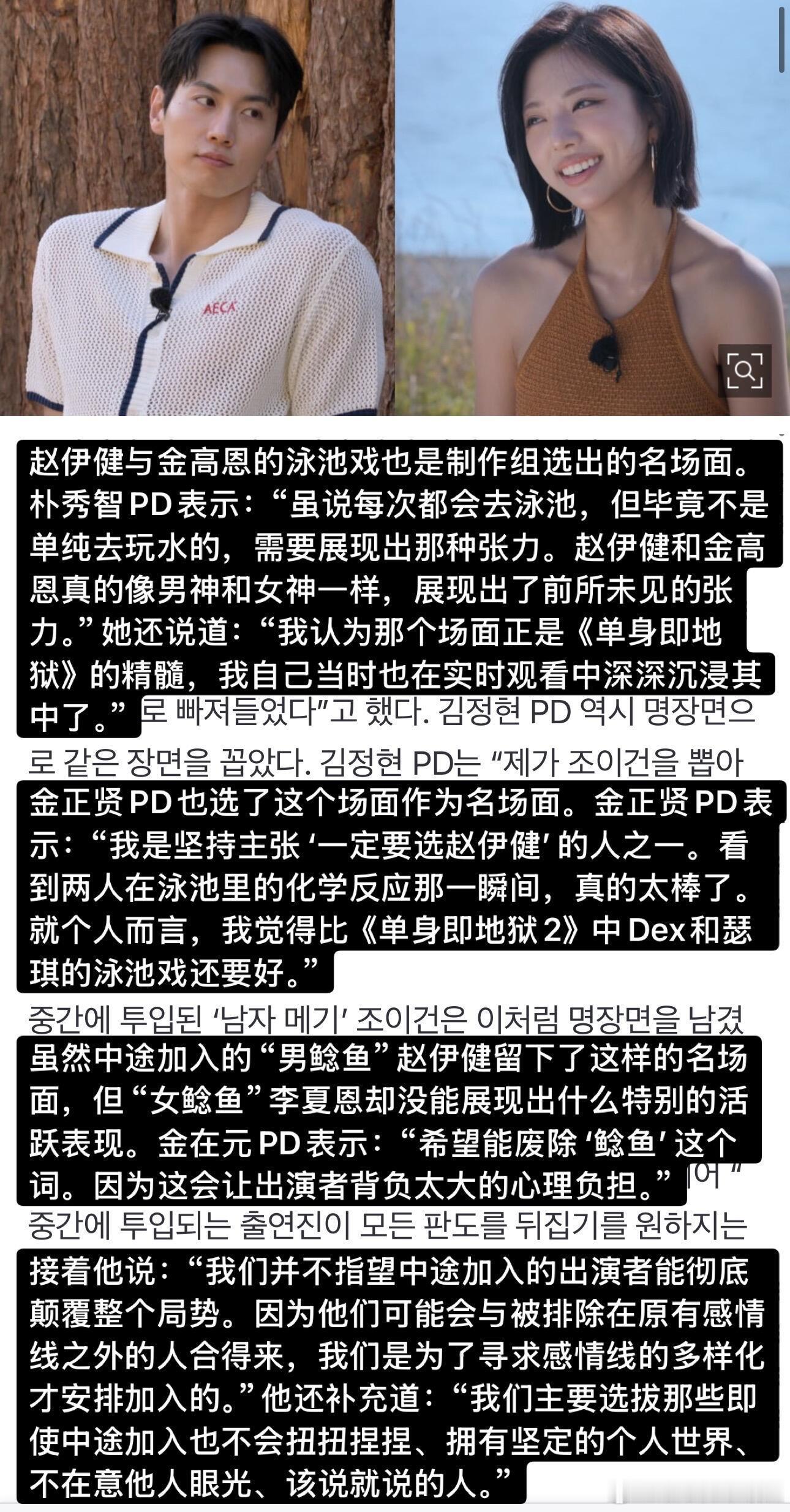 【单身即地狱】PD采访:李成勋是前总统孙子?PD采访看点整合:✅ PD给崔美娜秀行大礼感谢🙇♀️ 感谢真诚✅ 李成勋是李明博孙子?🤔 No 本人亲自否认✅ 超越Dex的泳池名场面🏊♂️赵伊健 & 金高银的泳池戏✅ 到底有没有现实情侣?💘具体情况会在特辑公开✅ 衣服90%是私服👗地狱岛不能用手机,连时间都不知道。那些好看的衣服90%都是出演者自己带的,制作组只给建议。✅ 天堂岛双人组约会修罗场是特意安排的😈✅ 关于“鲶鱼”和第六季📺PD希望废除“鲶鱼”这个词,给出演者压力太大。另外,第六季已经确定制作!