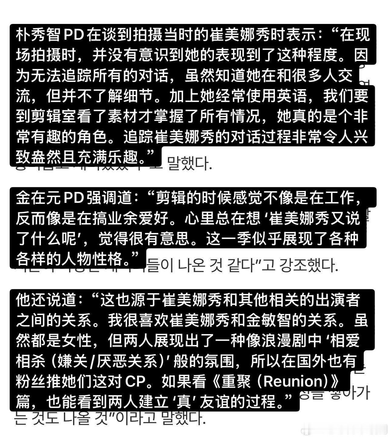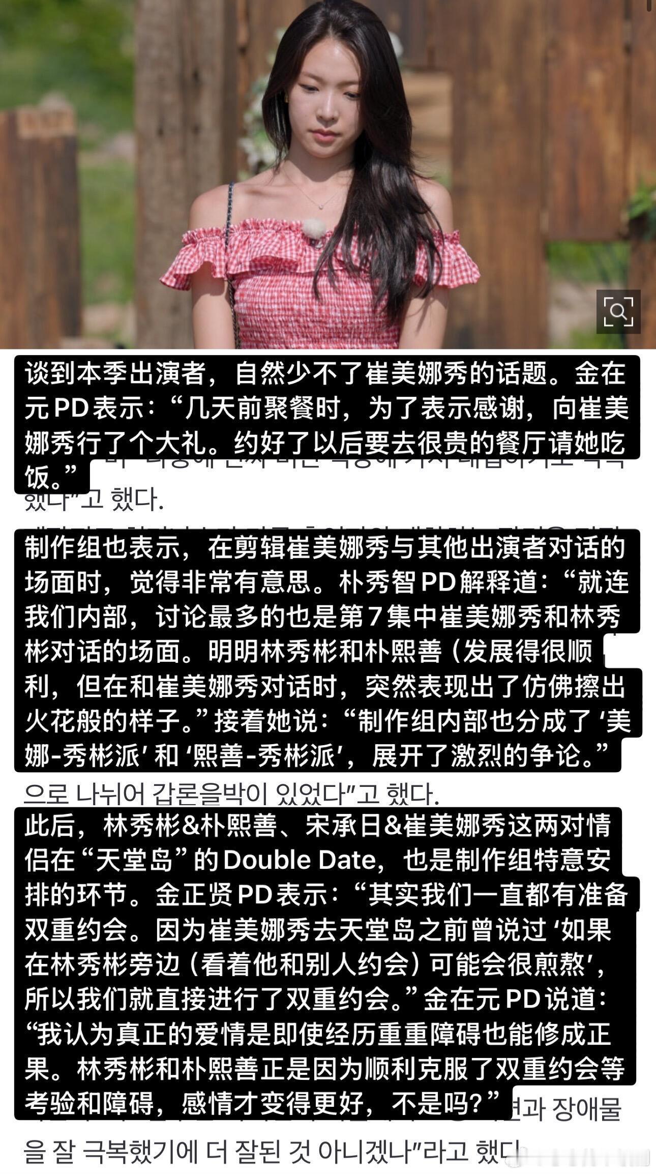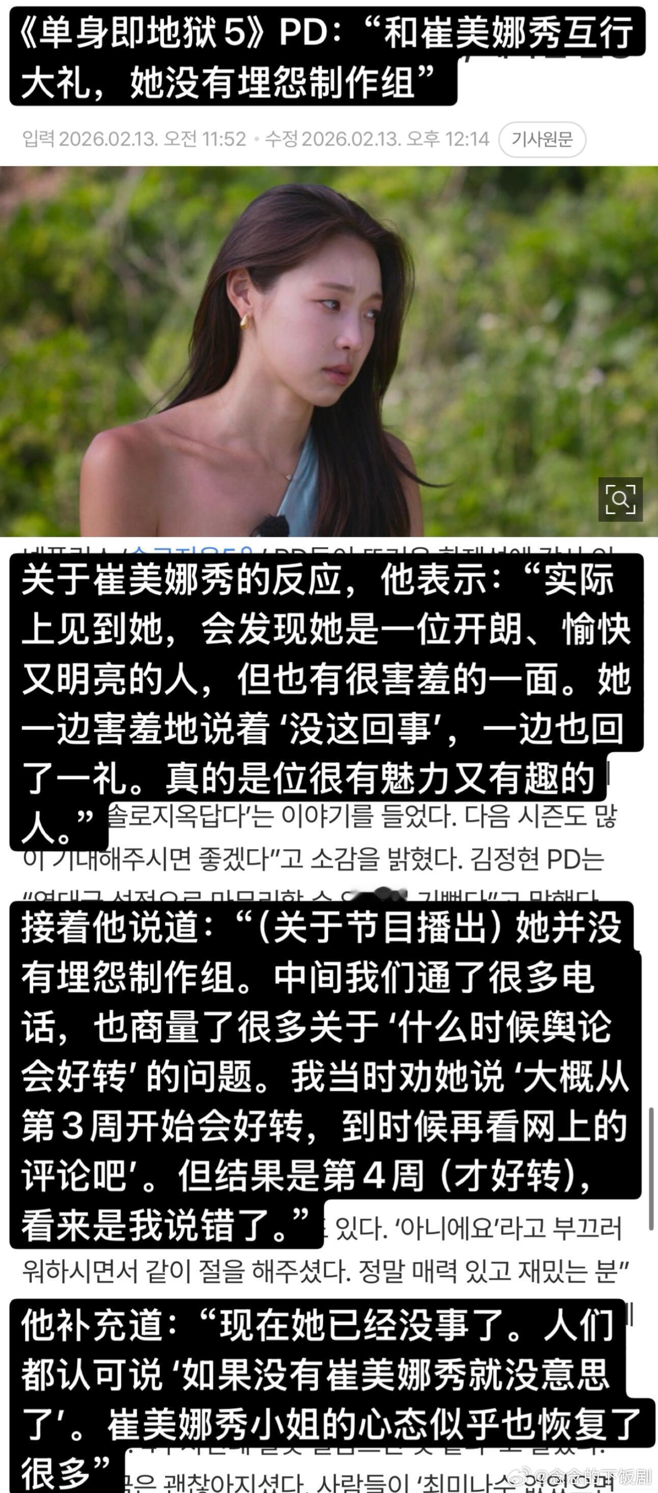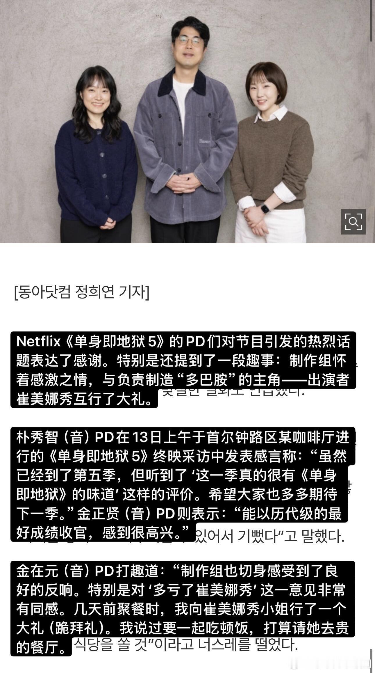 【单身即地狱】PD采访:李成勋是前总统孙子?PD采访看点整合:✅ PD给崔美娜秀行大礼感谢🙇♀️ 感谢真诚✅ 李成勋是李明博孙子?🤔 No 本人亲自否认✅ 超越Dex的泳池名场面🏊♂️赵伊健 & 金高银的泳池戏✅ 到底有没有现实情侣?💘具体情况会在特辑公开✅ 衣服90%是私服👗地狱岛不能用手机,连时间都不知道。那些好看的衣服90%都是出演者自己带的,制作组只给建议。✅ 天堂岛双人组约会修罗场是特意安排的😈✅ 关于“鲶鱼”和第六季📺PD希望废除“鲶鱼”这个词,给出演者压力太大。另外,第六季已经确定制作!