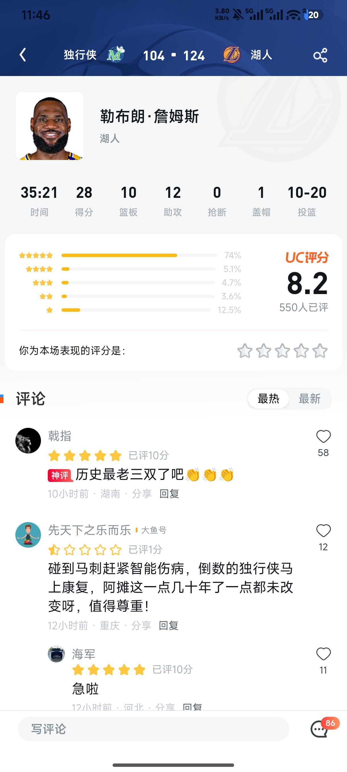 今天的湖人vs独行侠,老詹出场35分钟,28分10篮板12助攻,妥妥的大号三双,带队赢了20分。 点开评分一看,综合8.2分还算合理,但这评分分布给我看笑了—— 74%的五星(正常观众) 12.5%的一星(???) 我就想知道那12.5%的老哥是咋想的?是没看比赛只看比分,还是押了独行侠输钱了?这表现如果还给一星,那NBA就没几个能及格的人了。