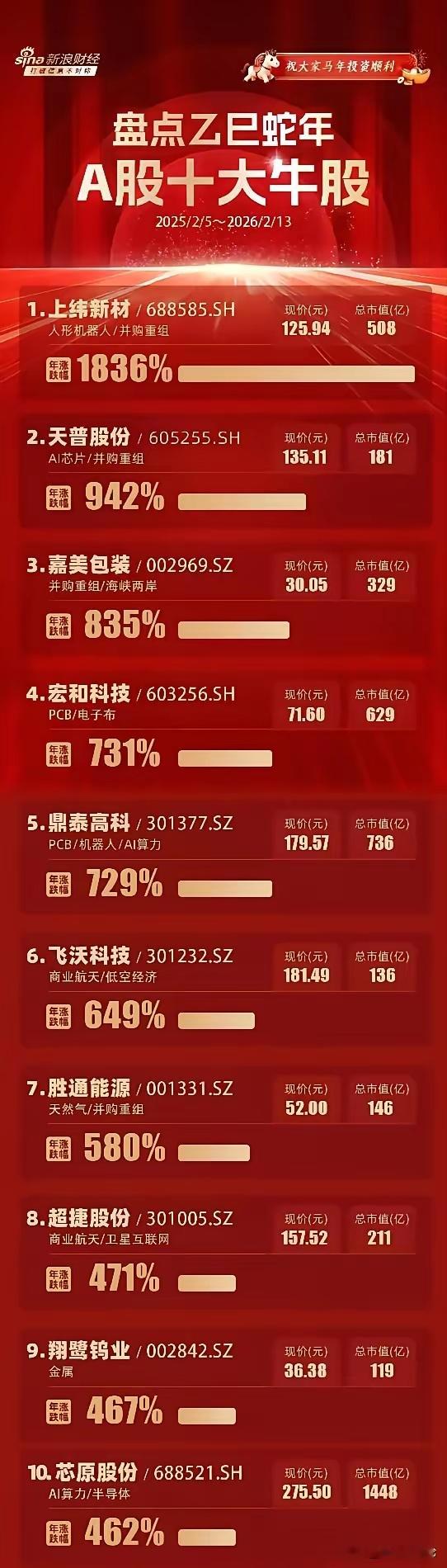 马年买什么股?答案在新浪财经给出的蛇年A股十大牛股名单里。从名单可以看到2025