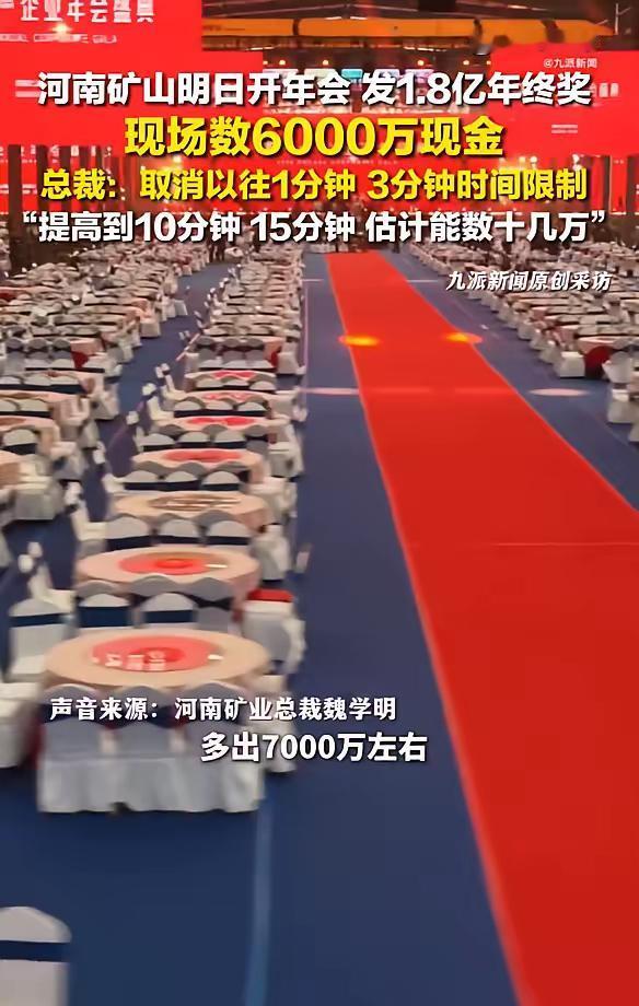 河南矿山发1.8亿年终奖! 全网最爱发钱的老板崔培军将于2月13日开年会,去年河南矿山集团累计盈利2.7亿,本次年终奖预计发1.8亿,再创新高,三分之二的利润都将分给员工。 有网友评论:企业文化很重要,企业往何处走领头人很关键,像崔总这样的企业家能以以德孝为先,以员工为重,人心思变,人心思干,何愁企业不发展,不壮大! 有苦同吃,有福同享!善作为、勇担当,将心比心、以心换心,视员工为家人,这样的老板打着灯笼都难找!良心老板,让人敬佩! 对此,你怎么看?
