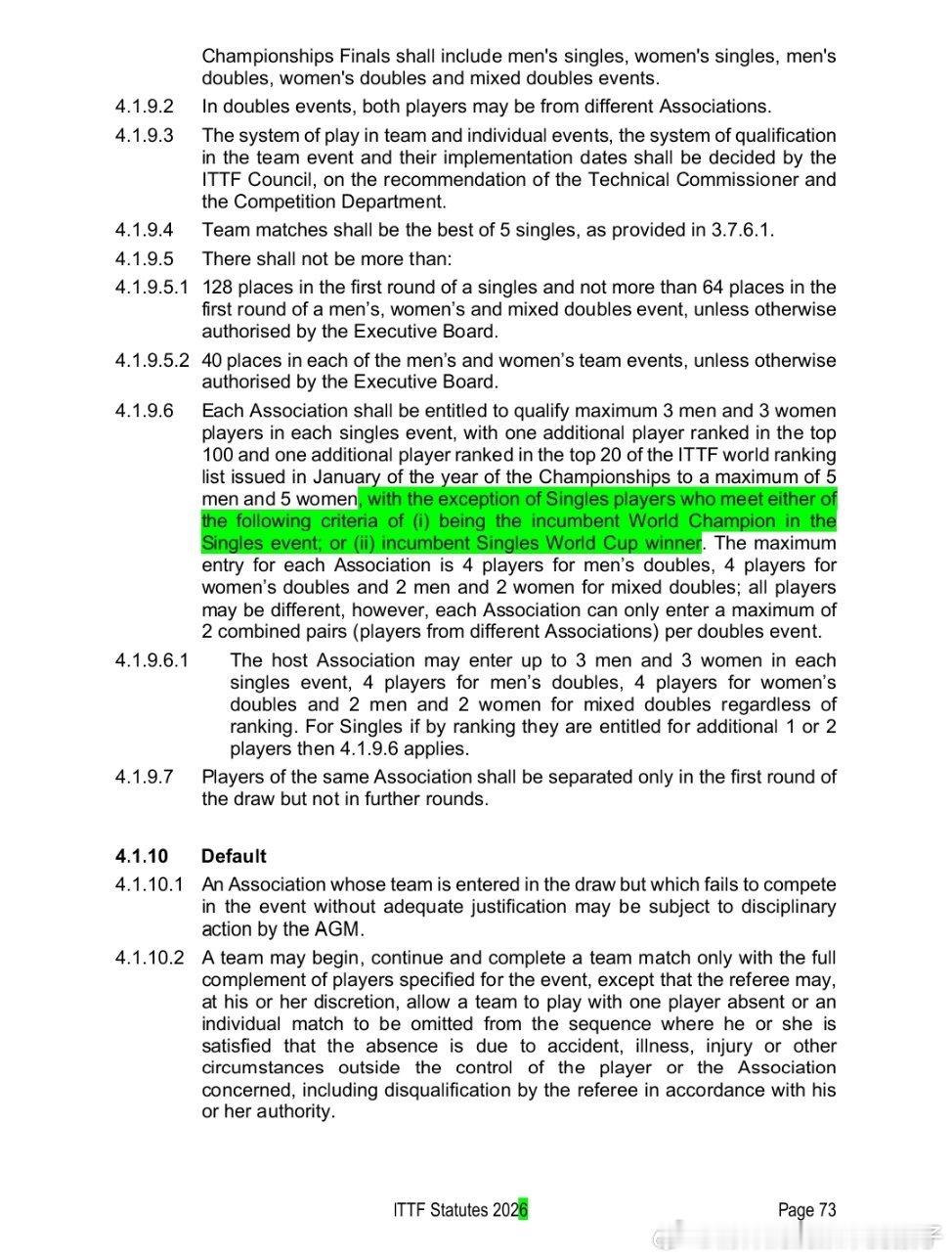 国际乒联2026年手册更新,世乒赛相关更新内容👀4.1.9.6 每个协会在每个单打项目中最多可派出3名男选手和3名女选手参赛,另有1名在锦标赛当年1月发布的国际乒联世界排名前100位的选手和1名前20位的选手可额外参赛,最多可增至5名男选手和5名女选手;但符合以下任一条件的单打选手除外:(i) 现任该项目的世界冠军,或 (ii) 现任单打世界杯冠军。每个协会在男子双打项目中最多可派出4名选手,女子双打项目中最多可派出4名选手,混合双打项目中最多可派出2名男选手和2名女选手;所有选手可以不同,但每个协会在每个双打项目中最多只能派出2对组合(来自不同协会的选手)参赛。