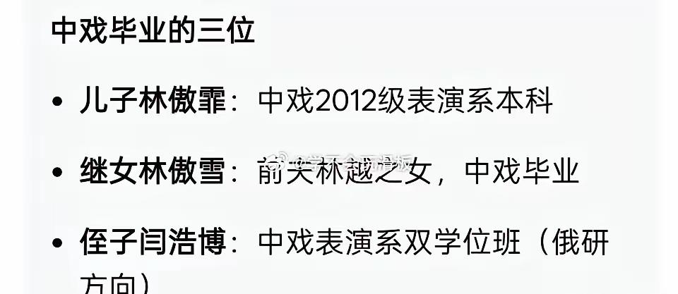 闫学晶,冲上热搜! ​13日,网上曝光,闫学晶3名亲属均毕业于中戏,再加上中戏表
