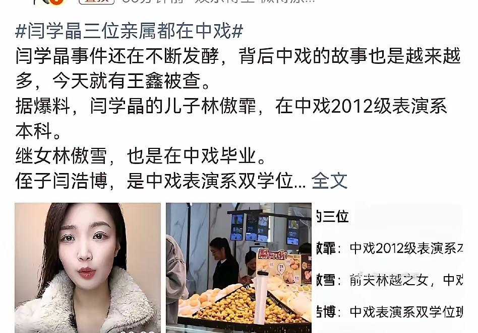 闫学晶,冲上热搜! ​13日,网上曝光,闫学晶3名亲属均毕业于中戏,再加上中戏表演系现任主任王鑫被查的消息,让这事儿更添悬念。 这条热搜在2月13日下午持续升温,相关话题阅读量短时间破亿,参与讨论的网友大多绕开了娱乐八卦,把目光对准了艺术教育的公平性与院校管理的规范性。 闫学晶是从东北农村走出来的演员,1972年出生于吉林东辽的普通农民家庭,年少时在地方小剧团学二人转,靠着扎实的曲艺功底, 2001年凭借《刘老根》里的山杏一角走红,此后二十多年扎根影视圈,出演六十多部作品,从农村妇女到职场女性,每一个角色都贴着生活的烟火气,也让她成了观众心中接地气的实力派。 她一直低调打理家庭与事业,很少卷入舆论风波,这次突然被推上风口,让很多看着她作品长大的观众觉得意外。 官方通报显示,中戏表演系主任王鑫因涉嫌严重违纪违法主动投案,目前正接受纪律审查和监察调查,这也是中戏短期内第三位被查处的院系管理者。 王鑫手握表演系招生、教学管理的核心权限,负责艺考选拔的流程把控与人才筛选,他的涉案直接触动了公众对艺考公平的敏感神经。 网络曝光的信息显示,闫学晶的儿子林傲霏2012年考入中戏表演系,继女林傲雪、侄子闫浩博也均毕业于该校表演系,三位亲属的求学经历与王鑫涉案的信息被网友拼接在一起,原本正常的升学背景,瞬间变成了舆论猜测的焦点。 闫学晶的儿子林傲霏当年入学时,曾因入学途径引发过小范围争议,中戏官方当时已做出澄清,否认了非常规录取的说法。 亲属通过正规艺考考入顶尖艺术院校,本身是符合教育规则的个人选择,闫学晶在行业内积累的人脉与资源,是职业发展的自然结果,并不等同于违规操作。 普通艺考生的备考之路满是艰辛,每天十几个小时泡在练功房、排练厅,只为在录取率不足1%的选拔里争一个机会,他们对公平的渴望,让大家对艺术院校的任何管理漏洞都零容忍。 公众的质疑从来不是针对闫学晶本人,而是担心艺术教育领域存在资源倾斜、选拔不透明的问题。中戏作为国内表演艺术的标杆院校,其招生流程与内部管理,直接影响着整个行业的人才生态。 近几年文艺领域的反腐行动持续推进,中戏多位管理者被查处,恰恰说明相关部门在直面行业乱象,用严格的监督净化艺术教育环境。 这样的整治不是针对某个人,而是为了守住艺考公平的底线,让每一个有才华的年轻人都能靠努力获得机会。 目前没有任何官方证据,能将闫学晶及其亲属与王鑫涉案事件关联起来,网络上的种种猜测,都只是基于碎片化信息的主观推断。 这样的推断很容易偏离事实,也会给无关人员带来不必要的舆论压力。闫学晶至今未对此事发声,她的沉默不是回避,而是在等待官方调查的完整结论,不想被无序的舆论裹挟。 她的演艺生涯靠的是日复一日的打磨,从二人转舞台到影视荧幕,每一步都靠作品说话,这份实力不该被无端的猜测掩盖。 艺术教育的核心是培养真正热爱表演、有专业能力的人才,规则的公平是行业发展的根基。 院校管理者的权力需要被监督,招生流程需要更透明,行业资源的分配需要更公正,这些都是公众真正关心的问题。 我们可以关注事件进展,却不能随意传播未经证实的信息,更不能用主观猜测替代事实本身。 守住艺术教育的公平,就是守住行业的未来,也是守住每一个追梦人的希望。规则面前人人平等,才华与努力才是艺术道路上最硬的通行证。 各位读者你们怎么看?欢迎在评论区讨论。