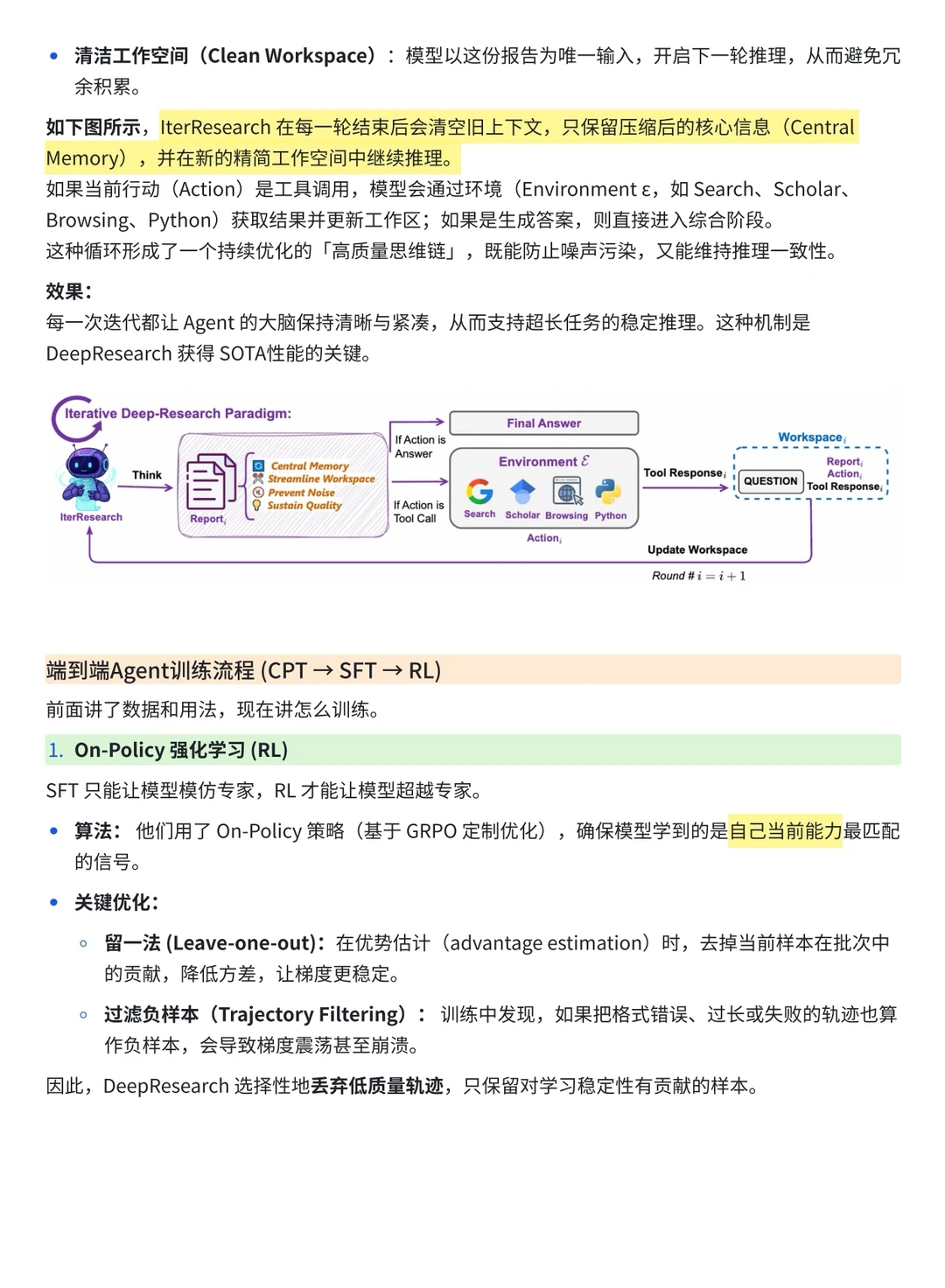 整体目标就是让模型像个真正的研究员,自己会上网、会分析、会总结,最后给你一份报告。它的训练闭环是 Agentic CPT → SFT → RL,最后通过 on-policy 强化学习让模型自己卷自己,学会怎么更聪明地去推理。