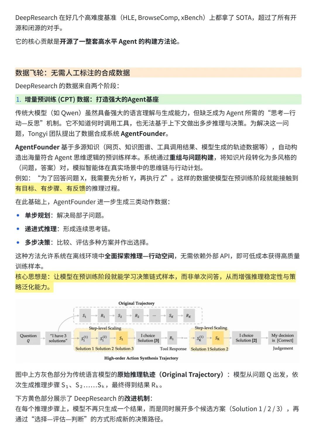 🤡答:DeepResearch 是阿里搞的一个 Agentic LLM 框架。它通过合成数据增量预训练 + 多阶段后训练,让模型在做复杂研究任务时的多步推理和工具调用能力变得超级强。