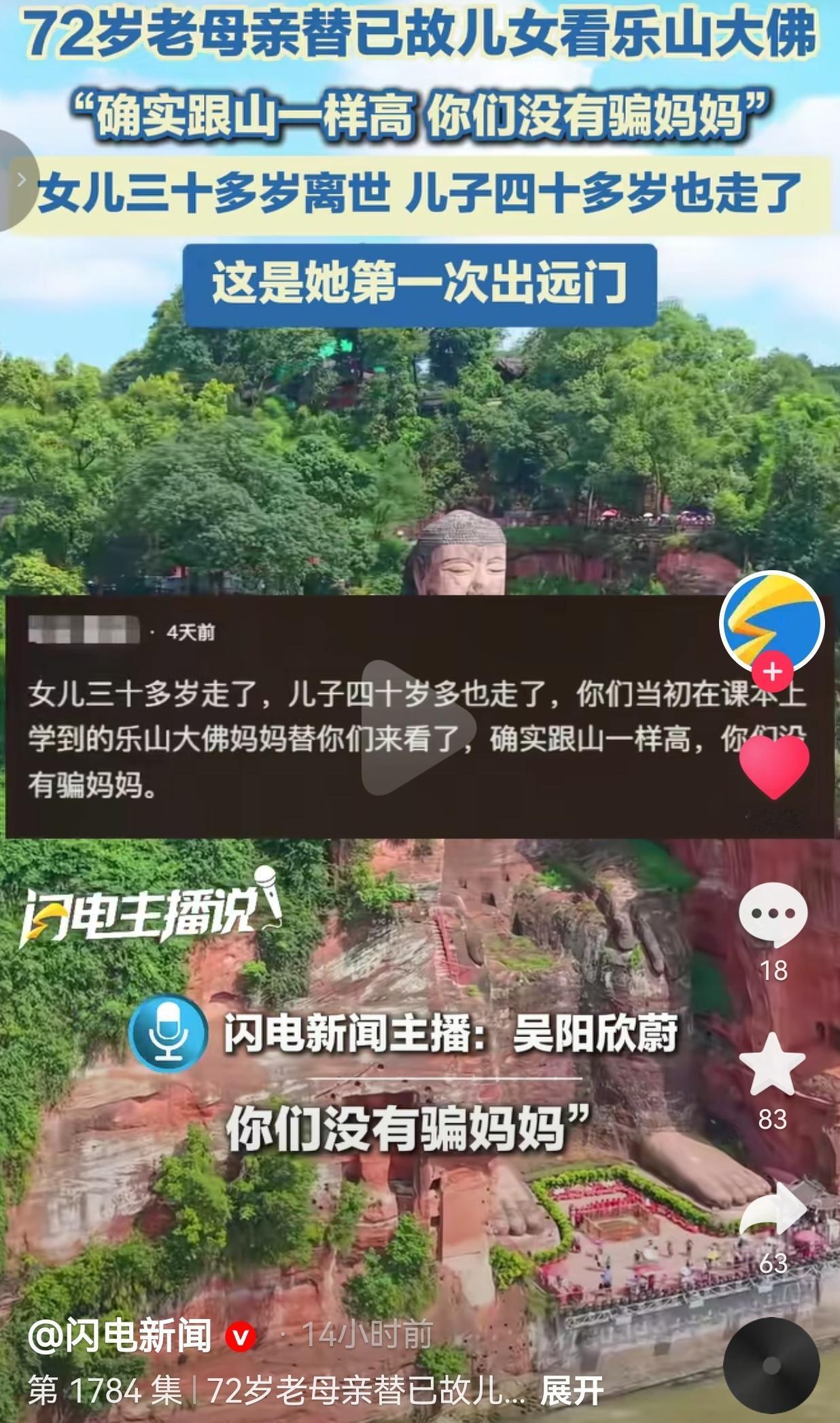 这母亲心里有多疼呀!中年一而再地失去一双儿女,白发人送黑发人的痛,只有经历过的人,才知道有多残忍呀! 近日,72岁的王阿姨,第一次出远门。她揣着儿女的照片,坐了十几个小时的车,从老家赶到四川乐山,就为了替两个先走一步的孩子,看看他们课本里念叨过的乐山大佛。 站在大佛脚下,她举着手机,对着镜头笑得像个孩子,可眼角的皱纹里全是泪,她哽咽地说:“确实跟山一样高,你们没有骗妈妈。” 谁能想到,这饱经沧桑的老人,早已承受过两次白发人送黑发人的锥心之痛。 女儿三十多岁就走了,没过多久,四十多岁的儿子也离开了她。这两个孩子,小时候总趴在她身边,指着课本上的乐山大佛说:“妈,等我们长大了,带你去看!” 他们长大了,可惜的是,还没有来得及带老母亲去乐山大佛,儿女都去世了。 这次,她拍了好多视频,大佛的每一个角度都拍了,好像这样,就能把这份风景,完完整整地带到另一个世界,交到儿女手里。 网友的评论,每一条都像刀子一样扎心,有的网友说:“阿姨,我替哥叫你一声亲妈吧!妈妈,你辛苦了。” 也有的网友说: “她不是在看大佛,她是在替孩子完成未竟的心愿啊。” 还有的网友说:“这根普通意义上的旅游不一样,这是一场跨越生死的奔赴。” 我想起我妈,去年我带她去北京,她在故宫里像个小姑娘一样,拉着我的手说:“你小时候总说要带我来,我还以为你忘了。” 原来,我们随口说的一句话,在父母心里,就是一辈子的执念。他们会等,会盼,会替我们完成那些我们没来得及做的事,哪怕我们已经不在了。 看到王阿姨的故事,让我突然明白:父母的爱,从来都不是轰轰烈烈的誓言,而是藏在每一次等待、每一次奔赴里的细碎温柔。 他们会记住我们说过的每一句话,会替我们完成每一个未竟的心愿,哪怕我们已经不在了。 而我们,总以为父母还很年轻,来日方长,总说“等有空了,等有钱了,就陪陪父母。” 可是,我们却唯独忘记了,父母年纪大了,真的经不起等待。更何况意外和疾病真的不知道哪天会到来。所以说,想陪父母做的事情,还是尽早实现吧!别给自己留下遗憾。