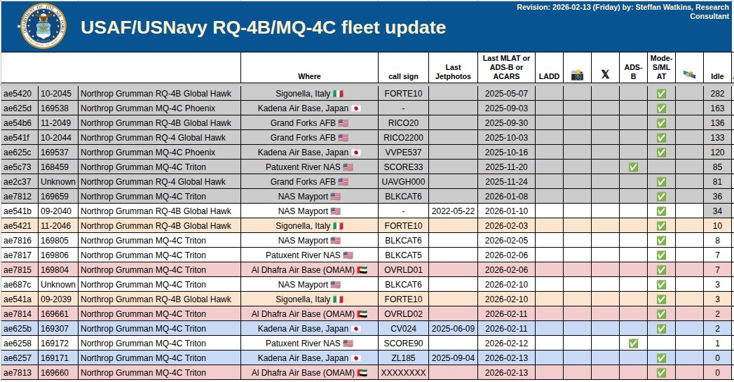 🔻RQ-4B Global Hawk / MQ-4C Triton 2026-02-12 状态➢ 约有 3 架从阿尔达夫拉空军基地 🇦🇪 起飞执行行动,监视伊朗 🇮🇷 ➢ 约有 2 架从嘉手纳空军基地 🇯🇵 起飞执行行动 ➢ 约有 2 架从西戈内拉 🇮🇹 起飞执行行动🔻via SteffanWatkins 热点现场海外新鲜事全球最大航母驶向中东