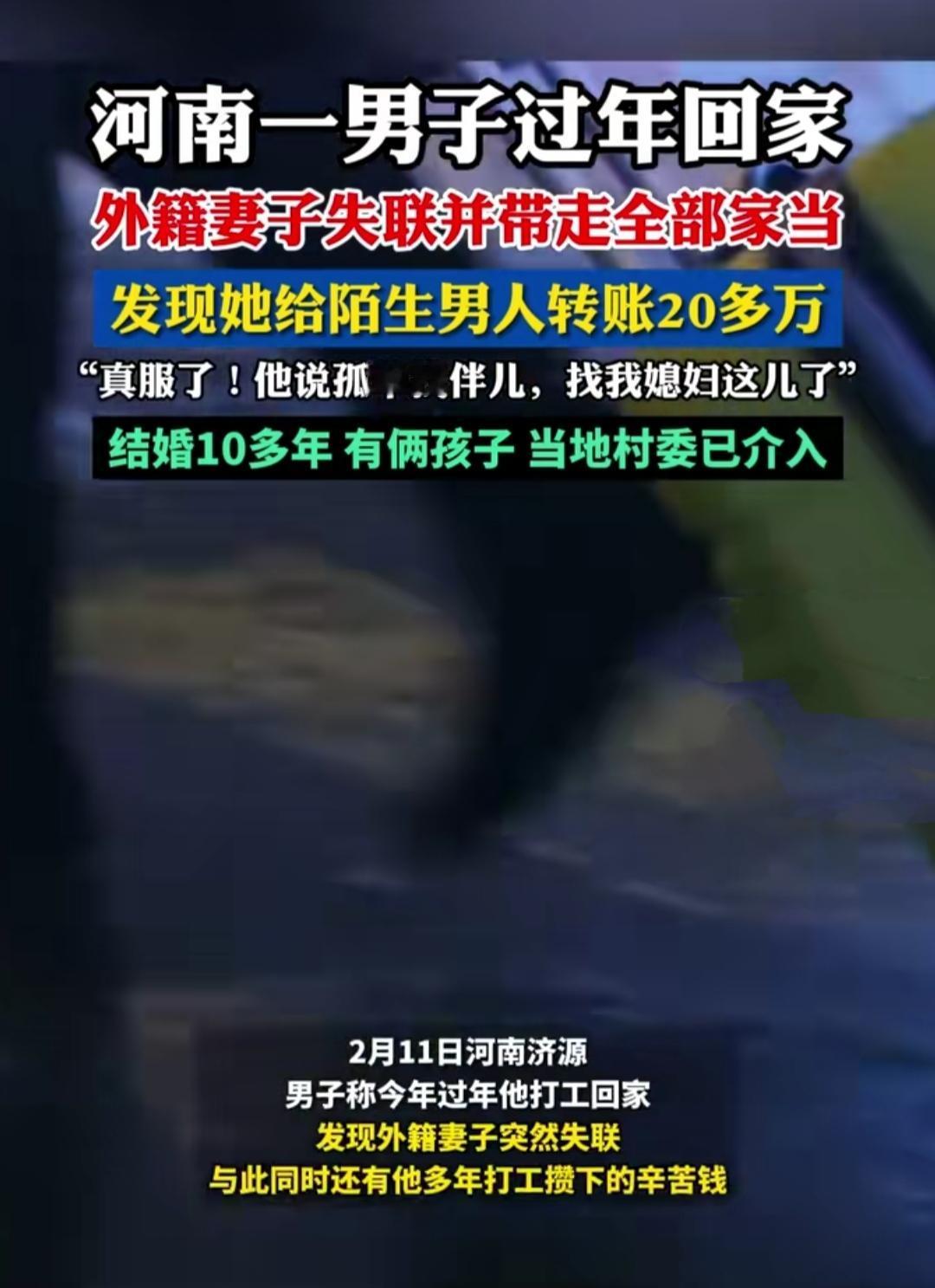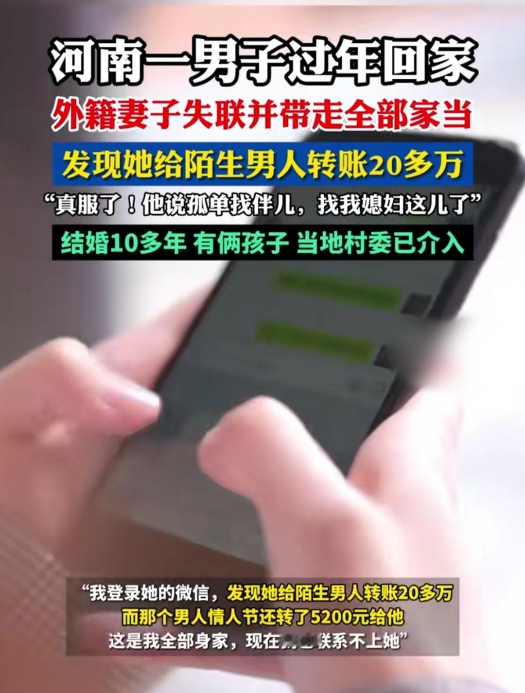 在外打工一年,满心欢喜回家过年,谁能想到等来的不是团圆,而是一场晴天霹雳。河南这位大哥怎么也没想到,结婚十余年的外籍妻子突然失联,家里的家当也被悉数带走,独留他面对空荡荡的屋子。 更让人揪心的是,登录妻子微信后,大哥发现自己多年打工攒下的20多万积蓄,全被妻子转给了一名陌生男子,还有5200元的特殊金额转账,对方朋友圈甚至挂着和妻子的亲密合影,转头却否认相识。 原来妻子自2024年外出打工后,两人的感情就悄悄变了味,如今人早已身在国外,彻底断了联系。更唏嘘的是,妻子的闺蜜也曾给这名男子转钱,讨要未果后心梗离世,一桩事牵扯出诸多无奈。 目前村委已经介入协调,大哥也准备报警维权,那20多万的夫妻共同财产,终究是藏着太多说不清的纠葛。十年相伴,最后落得这般境地,个中滋味,也只有当事人自己能体会了。
