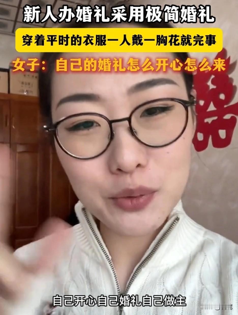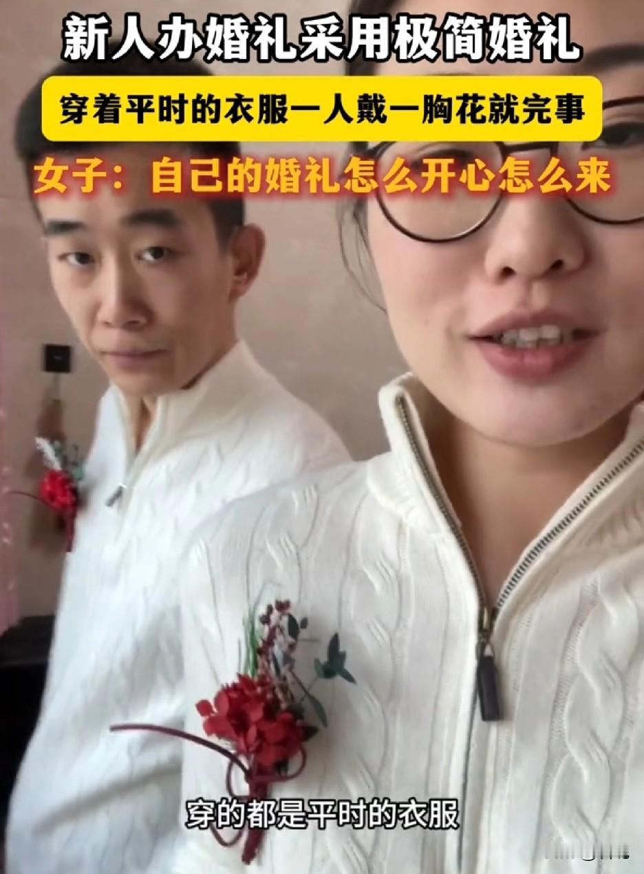 这女子再次刷新我对极简婚礼的认知,穿着平时的白色衣服戴个胸花,连化妆师都没请。女子称,自己的婚礼怎么开心怎么来! 极简婚礼指的是,少人、少流程、少装饰。注重的是仪式感,这女子倒好,婚纱也不穿,妆不化,就戴个胸花。知道以为你是新娘是女主角,不知道以为你是参加别人婚礼的贵宾。很尊贵的表现,但是唯独不像是新娘本人。 如果两人真是想省钱,完全可以不举办婚礼,就领个证书可以了,那样更加简单。看新郎新娘的装扮,这是以举办婚礼为名,实则是收份子钱。 再极简的婚礼,该有的喜庆还是要有的,简单不代表简陋。如果自己都不当回事,别人更加不会把你当回事。如果新郎有良心,会珍惜新娘付出和牺牲。如果新郎没良心,还会跟兄弟炫耀,我娶的老婆特便宜。 当然,每个人想法不一样,理解也不一样。不过日子是女子的,婚礼也是女子的,她开心就好! 祝他们新婚快乐,百年好合!
