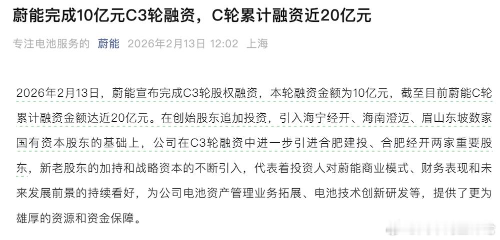 蔚来 2月13日:蔚来集团和宁德时代等公司共同投资的武汉蔚能电池资产有限公司(简称:蔚能)宣布完成C3轮股权融资,本轮融资金额为10亿元,截至目前蔚能C轮累计融资金额达近20亿元。蔚能完成10亿元融资据悉,在创始股东追加投资,引入海宁经开、海南澄迈、眉山东坡数家国有资本股东的基础上,公司在C3轮融资中进一步引进合肥建投、合肥经开两家国资背景股东。官方表示,此次融资资金将主要用于公司电池资产管理相关业务的投放和技术研发、资源循环等业务领域,助力蔚能电池资产管理服务水平的持续提升,增强公司研发和资金实力,加速科研成果的产业化落地。