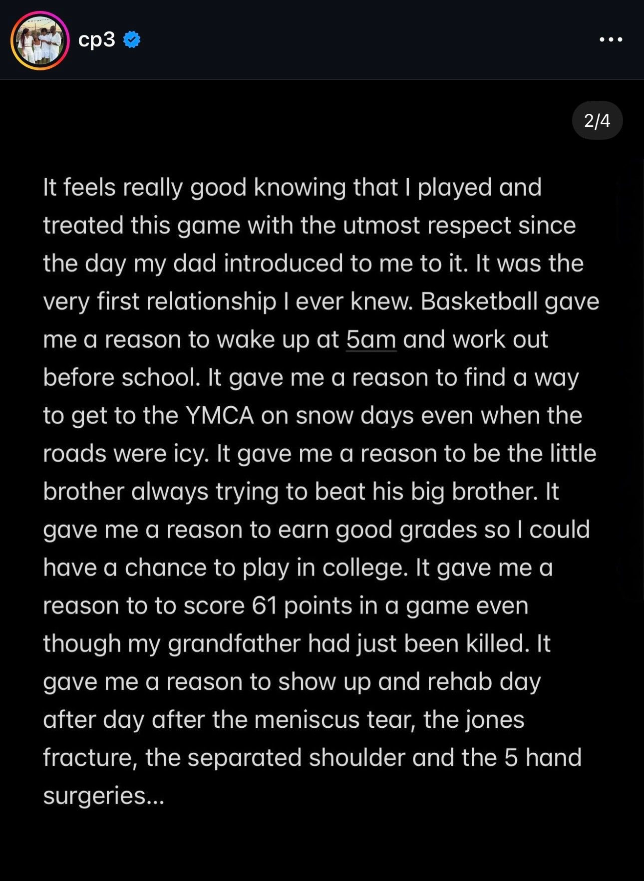 它让我有理由在清晨5点起床,在上学前锻炼;让我有理由在下雪天,即使道路结冰也要想办法去基督教青年会;让我有理由成为那个总是试图击败哥哥的小弟弟;让我有理由争取好成绩以获得大学打球的机会;让我有理由在祖父刚刚遇害后仍砍下61分;让我有理由在半月板撕裂、琼斯骨折、肩关节分离和五次手部手术后日复一日地坚持康复……