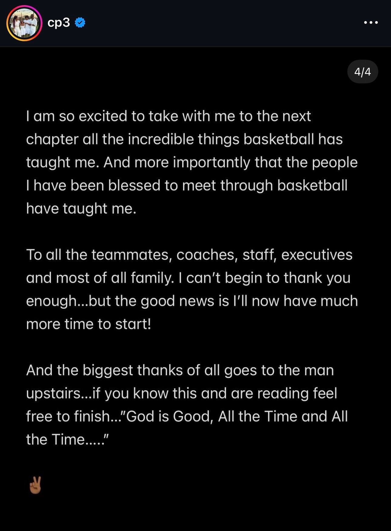 所以,此刻怀着我能拥有的全部感恩……是时候让我为了他人、以其他方式"出现"了。上一个赛季,我知道除非我能和家人一起在家乡,否则我无法继续。离开那六年的时光对我们所有人都是巨大的牺牲,我知道那必须结束了。我现在全心全意地明白,我能够成为的最好的队友,就是对于我的妻子茱达、我的儿子克里斯二世和小卡姆!!