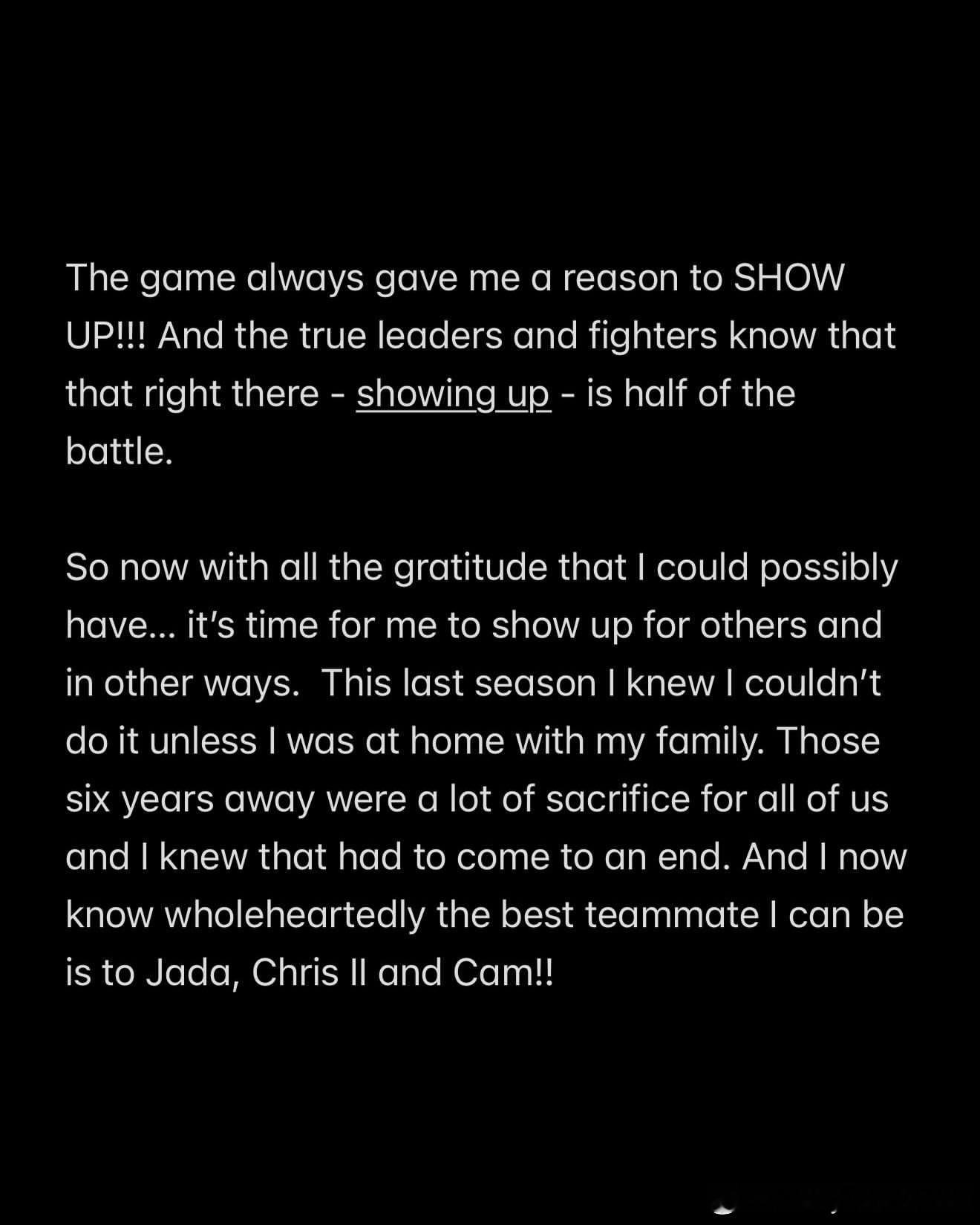 所以,此刻怀着我拥有的全部感恩……是时候让我为了别人以其他方式"登场"了。上个赛季,我知道除非我能和家人一起在家乡,否则我没办法继续打球,离开那六年的时光,对我们所有人都是一种巨大的牺牲,我知道这种牺牲必须结束了。我现在完全明白,我能够成为的最好的队友,就是对于我的妻子贾达、我的孩子们,CP4和小卡姆——作为丈夫、父亲!