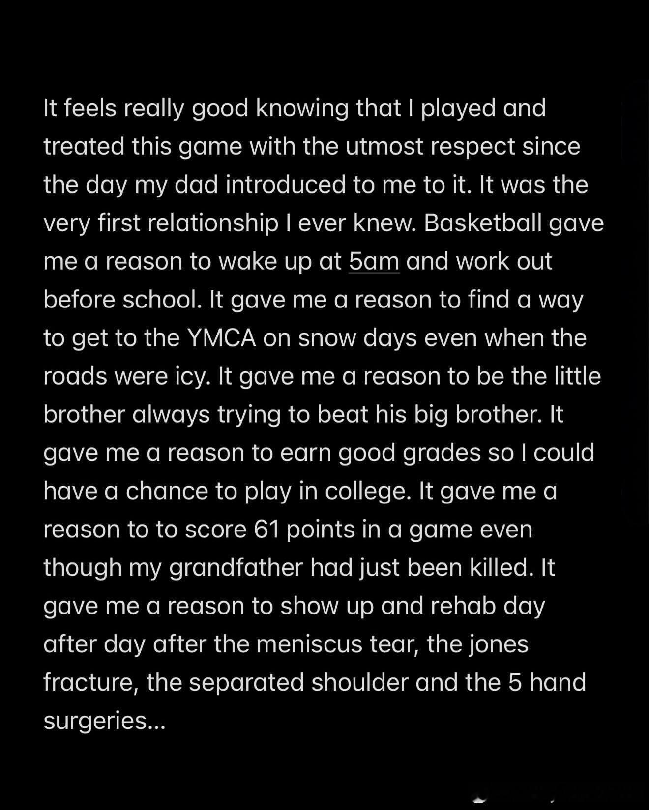 我无比兴奋能将篮球教会我的所有不可思议的东西,都带到我的人生的下一篇章,更重要的是,我能够通过篮球有幸拥有遇到的人们教会我的一切。致所有的队友、教练、工作人员、管理层,当然,最重要的是我的家人,我对你们的感激无以言表,好消息是,我现在将有更多的时间来开始新的生活,向你们表达谢意了。