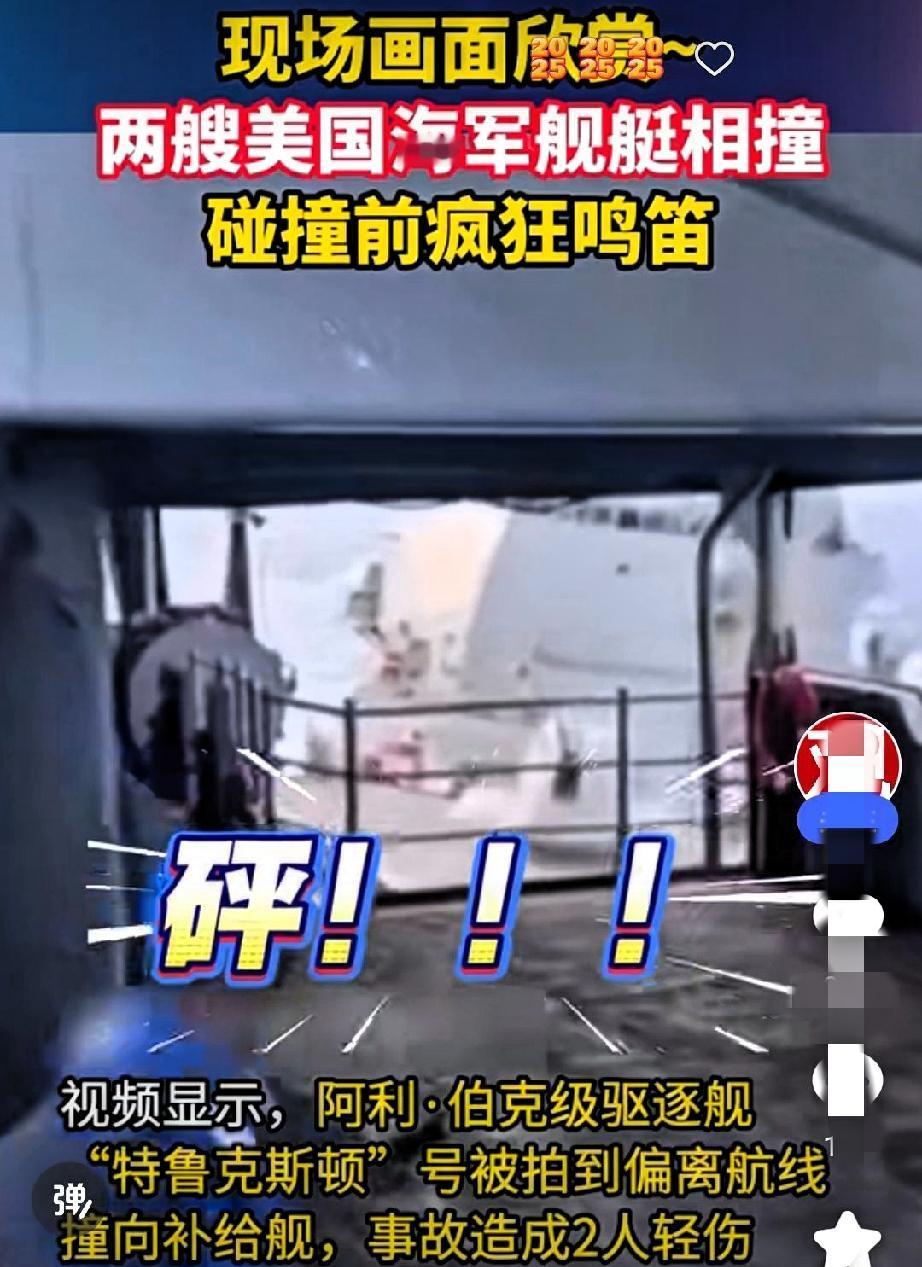 画面欣赏~ 两艘美国海军舰艇相撞,碰撞前疯狂鸣笛,结果还是“砰”的一声! 这操作,我愿称之为“海上版速度与激情”! 一艘阿利·伯克级驱逐舰“特鲁克斯顿”号,硬是把自己开成了“马路杀手”,直接怼上了补给舰。 这已经不是简单的“撞船”事故了,这简直是“惊心动魄“的公路追尾!