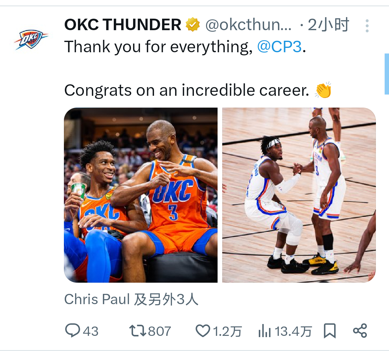 保罗官宣退役后雷霆马刺鹈鹕火箭勇士官推都发文致敬了一下快船太阳没发n