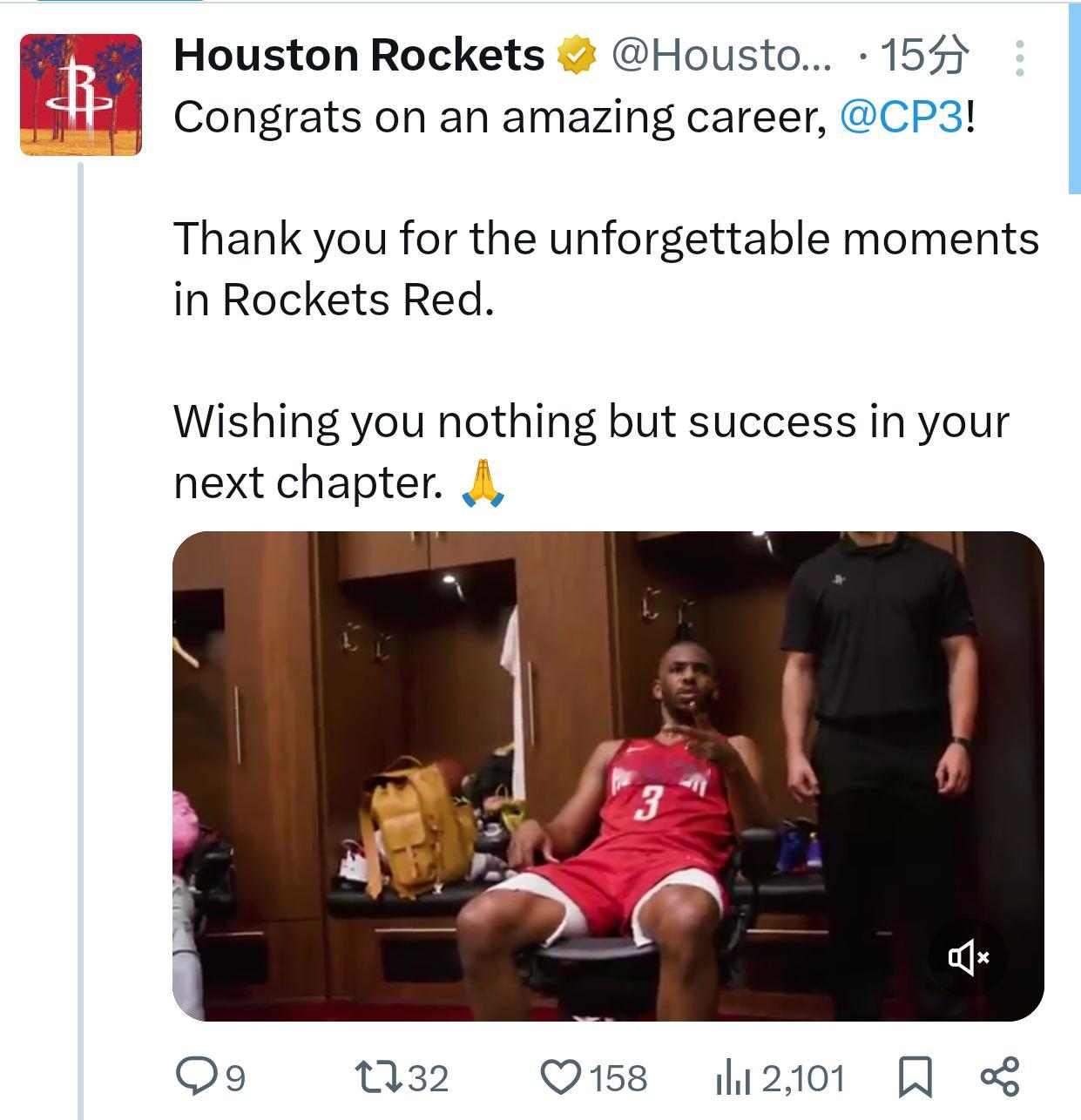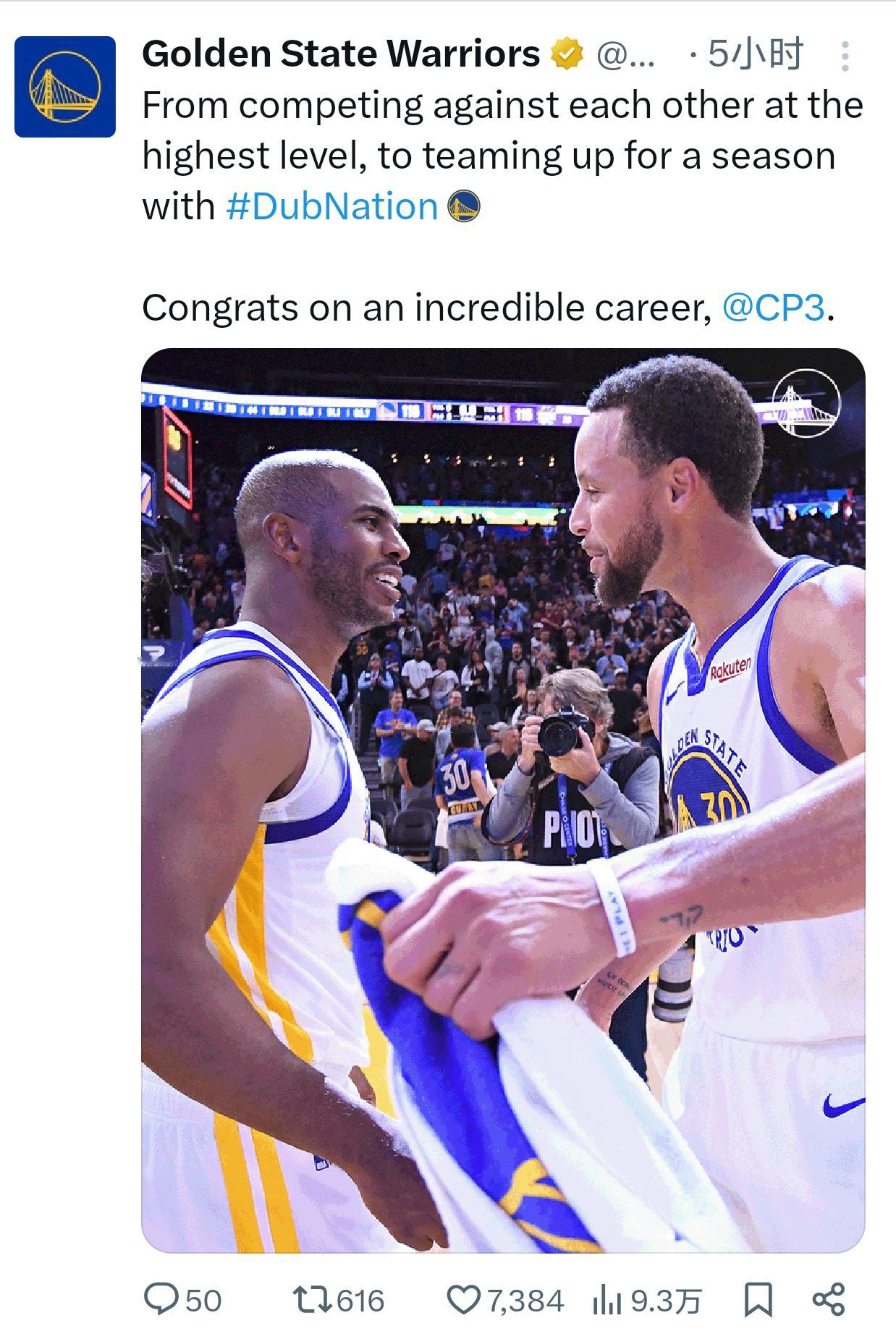 保罗官宣退役后雷霆 马刺 鹈鹕 火箭 勇士官推都发文致敬了一下快船 太阳没发n
