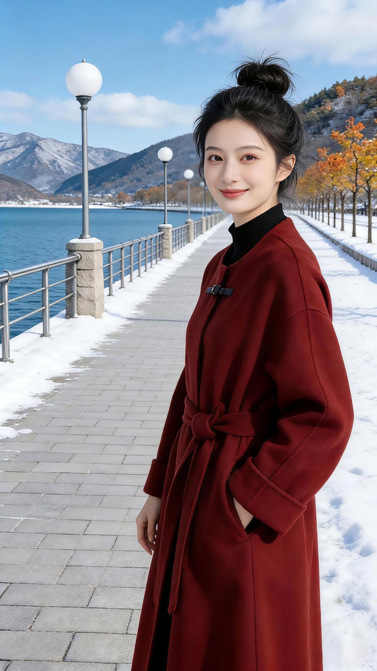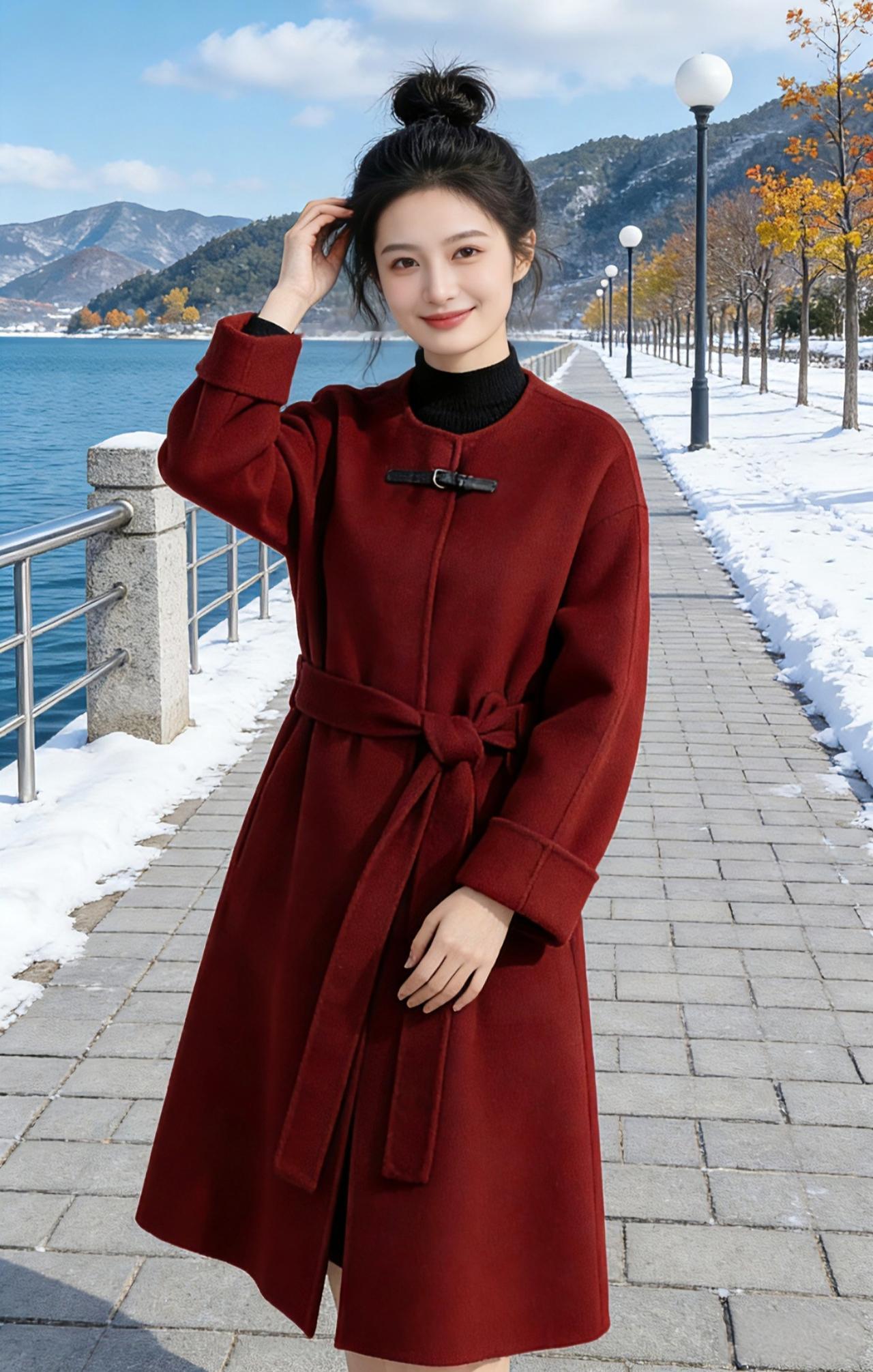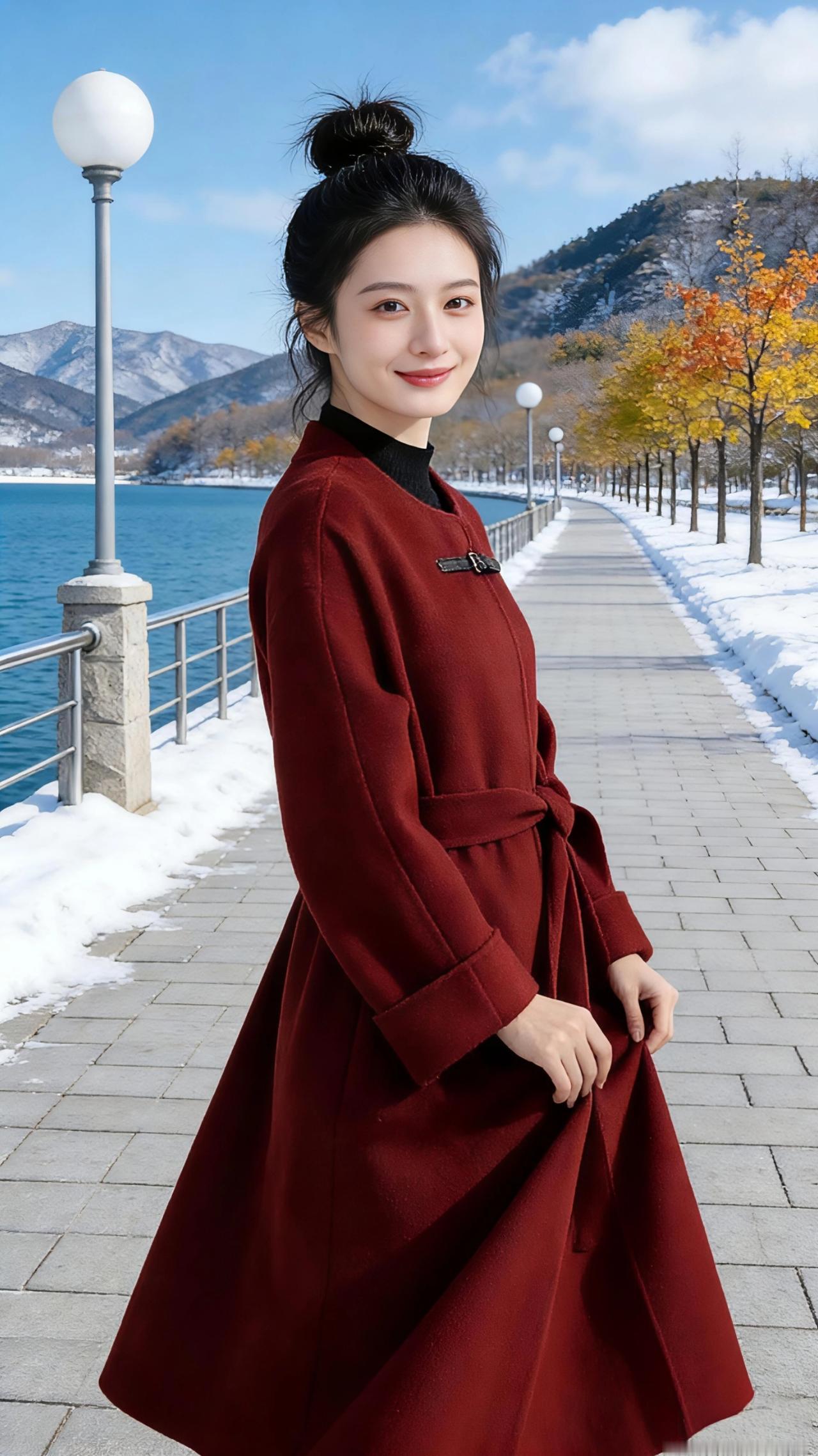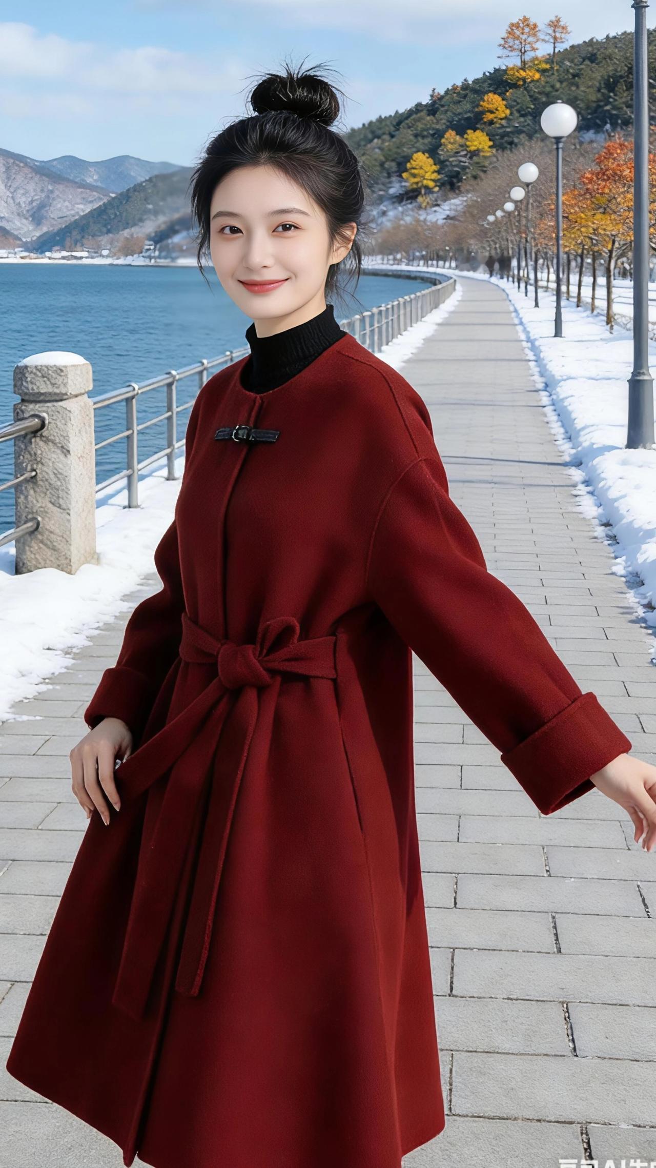 湖畔冬行 雪还未化尽,沿着湖岸的石板路漫行。 风是清冽的,却不刺骨,像被这一汪碧水柔化了棱角。远山覆着薄雪,在晴光里泛着淡青的轮廓,近处的树还留着秋的余韵,金红的叶与未褪尽的绿交织,在雪地上投下疏朗的影。 她裹着那件酒红大衣,同色的腰带在腰侧挽成一个柔软的结,黑高领衬得肤色愈发白皙。头发松松挽成一个髻,几缕碎发被风撩起,贴在颈侧。抬手掠发的瞬间,指尖拂过发梢,也拂过这冬日里难得的暖意。 湖面是沉静的蓝,像一块被精心打磨的宝石,映着云影与山形。栏杆外的雪还白得耀眼,踩上去会发出细碎的声响,却被湖水的呼吸轻轻盖过。她偶尔驻足,侧首望向远方,笑意漫在眼底,像这晴日里的光,不烈,却足够明亮。 脚步轻缓,向前两步,又向后退去,像是在与这冬日的风对舞。衣摆被风掀起一角,露出一点黑裤的边缘,与酒红的大衣撞出利落的层次。她伸手轻提衣料,指尖划过柔软的毛呢,也划过这一段被雪与光温柔包裹的时光。 没有喧嚣,只有风过林梢的轻响,与湖水拍岸的低语。这一方天地,仿佛只为她而静。而她,也在这静里,成了一幅流动的画——红与白,蓝与金,都在她的身影里,慢慢晕开,成了冬日里最动人的一笔。 高级感穿搭 新年穿搭 冬季穿搭 穿搭