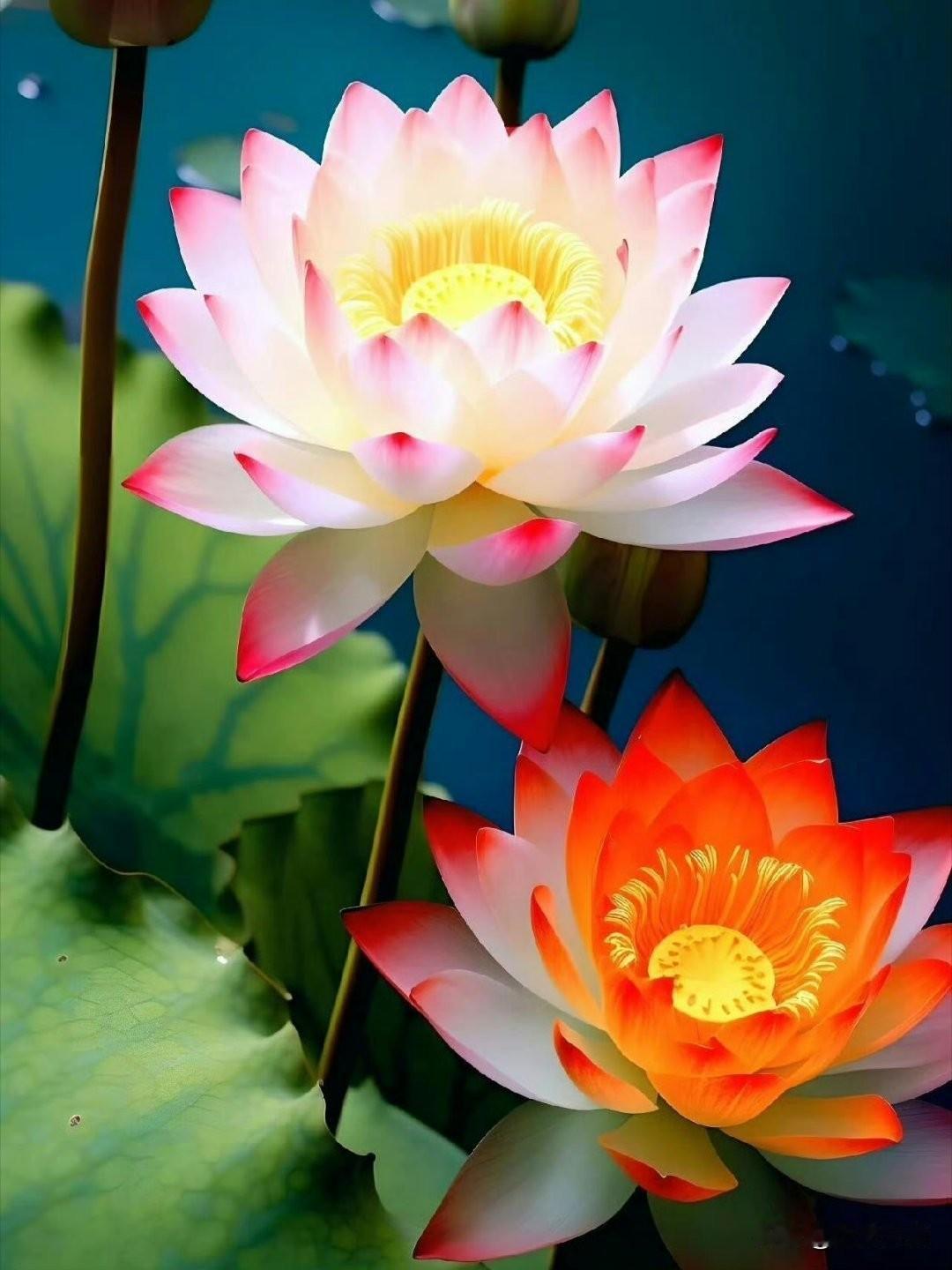 这两朵莲花好漂亮,像油画一样。