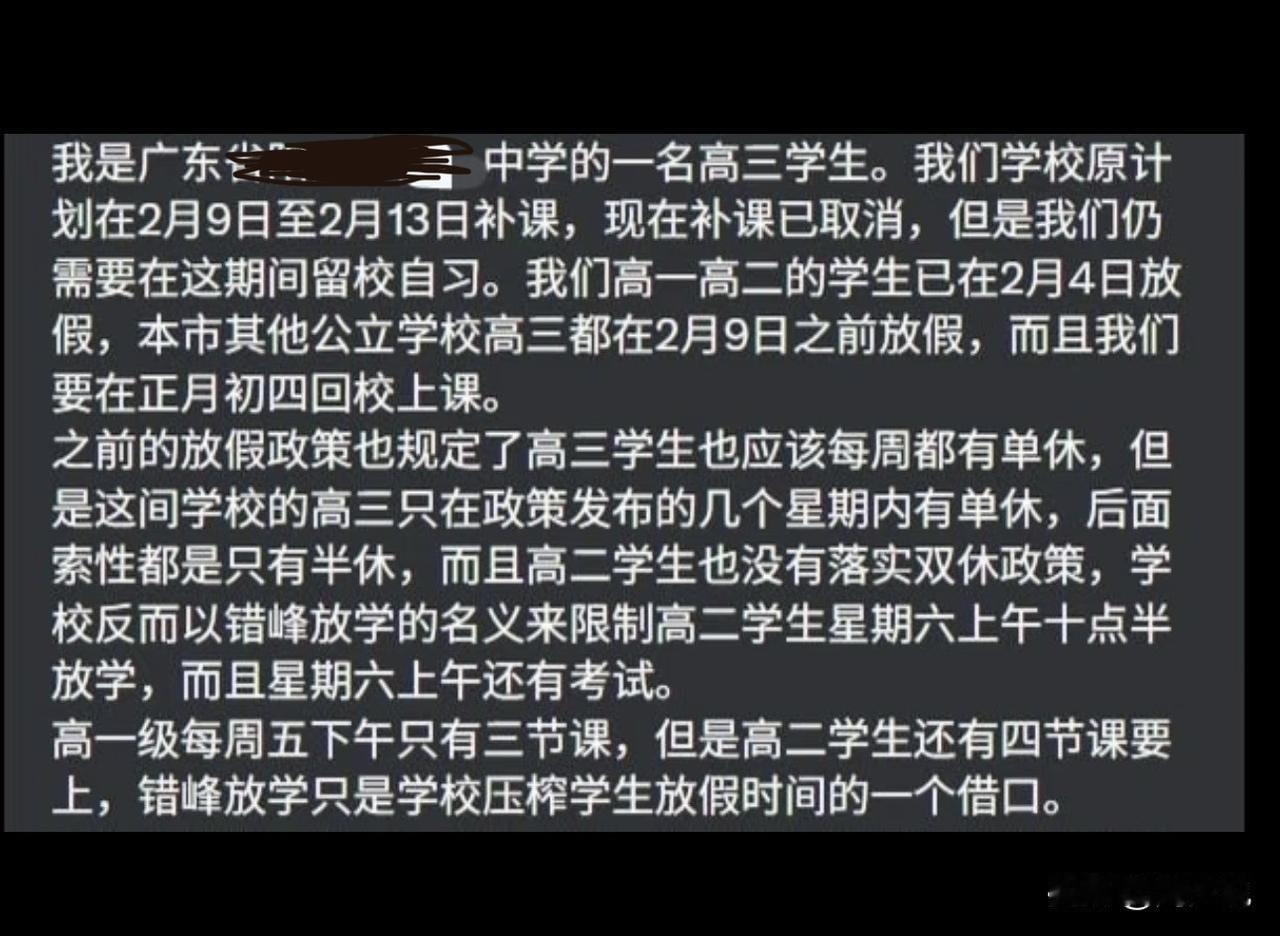 “错峰放学,竟成变相压榨假期?”网传广东一名高三学生吐槽,引发不少家长和学生共鸣。学校原定2月9日至13日补课,如今虽取消补课,却要求全体高三生留校自习。该校高一高二早在2月4日就已放假,本地其他公立高中,高三也都在2月9日前完成放假,而这所学校,竟要学生正月初四就回校上课。 不止如此,按政策要求,高三生每周应有单休,可该校只在政策刚出台时执行了几周,之后便只剩半天休息。 高二本该落实双休,学校却打着错峰放学的旗号,安排周六上午考试,十点半才准放学,等于变相压缩假期。高一周五仅三节课,高二却要上四节,所谓错峰,更像是挤占学生休息时间的借口。 此事曝光后,引发众多网友热议。有网友感慨:“同为高三家长,看着孩子连轴转真的心疼,过度压榨未必有效果。” 也有学生表示:“不是不想学习,是连喘口气的时间都没有。” 客观的说,周少觉得高中阶段的学习,从来不是拼时长、拼压榨。一味挤占休息时间,反而会让孩子身心疲惫,效率大打折扣。 学校用看似合理的名义压缩假期,看似是抓成绩,实则忽略了学习的规律和学生的身心健康,应该多看看学生的实际需求。 实际上,真正高效的学习,是张弛有度,是让学生在合理的节奏里稳步提升,而不是靠无休止的留校、提前返校来硬熬。 教育的本质,是培养健康成长的孩子,不是制造只会刷题的机器。学校在抓成绩的同时,也该多站在学生的角度考虑,守住政策底线,给孩子留一点喘息的空间,才是对学生更负责的做法。#寻美三湘#