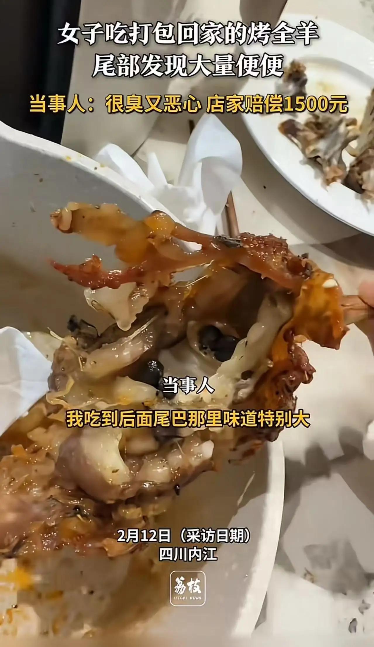 当场yue出来!烤全羊里全是粪便,女子崩溃:太臭太恶心! 浙江一女子去吃烤全羊,本来开开心心,结果切开一看直接傻眼—— 肉上居然沾着大量粪便残留,又臭又脏,当场恶心到崩溃! 找店家理论,对方态度还敷衍,只赔1500块就想了事! 评论区更炸了,网友真实吐槽: - “我去朋友家吃肥肠,没洗干净,一口下去直接吞了坨粑粑,这辈子阴影!” - 外面吃饭真的要看干净程度,这种没处理干净的,真的太倒胃口! 花大钱吃顿饭,结果吃一肚子恶心, 食品安全真的不能马虎,太败好感了!烤全羊 全羊烤全羊 新彊烤全羊 素材取于网络侵权删除