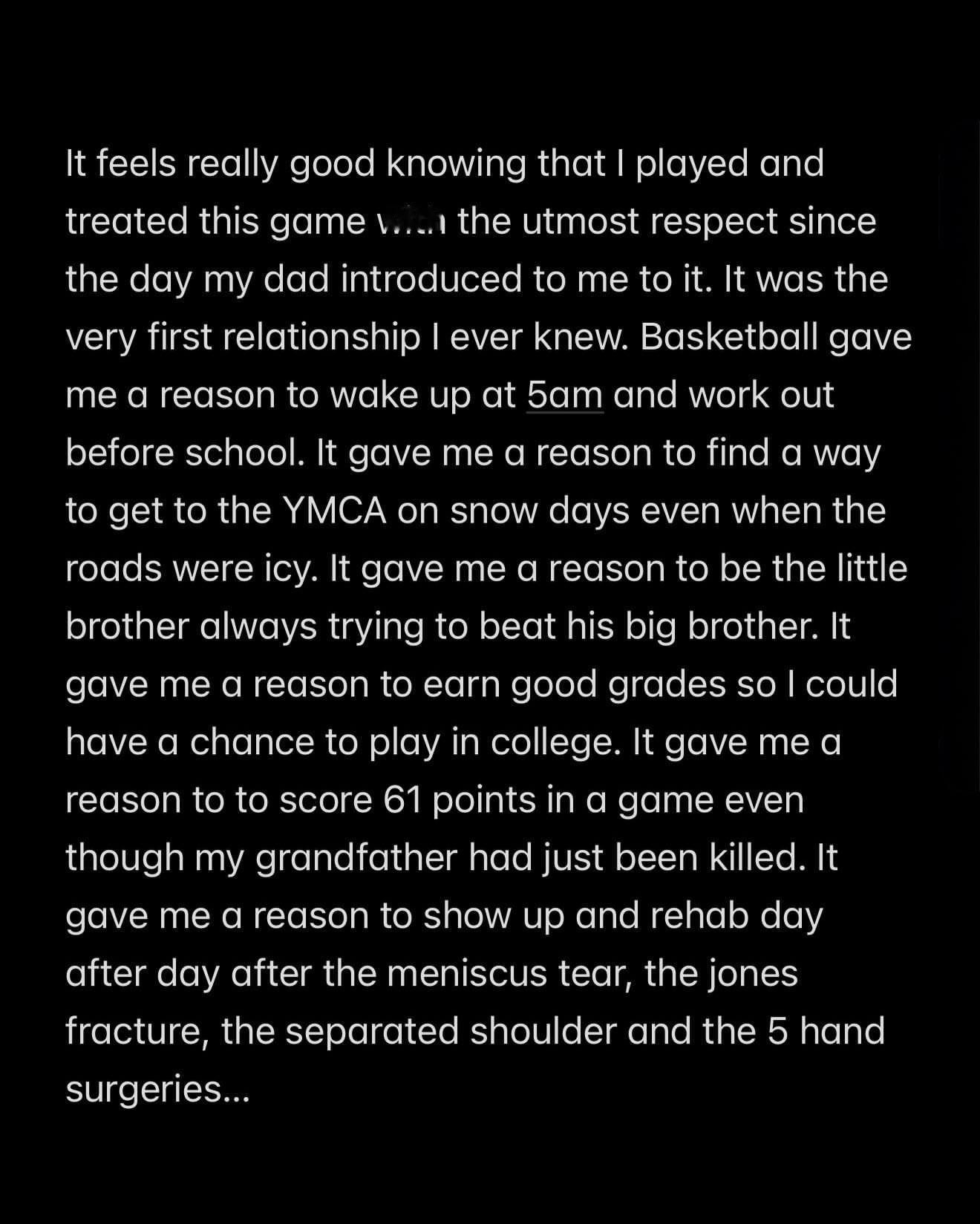 它让我有动力在清晨5点起床,在上学前锻炼球技;让我有理由在下雪天,即使道路结冰封路的情况下也要去YMCA;让我成为那个总是试图击败自己哥哥的弟弟;让我有理由好好读书争取好成绩,以获得在大学打球的机会;让我有理由在我的祖父遇害后砍下61分;让我有理由在半月板撕裂、琼斯骨折、肩关节分离和五次手部手术这些伤病后,日复一日地坚持康复。篮球总是给我一个"我要登场(show up)"的理由!!!真正的领导者、斗士会知道,"我要登场"本身就是“我要战斗”的一部分。