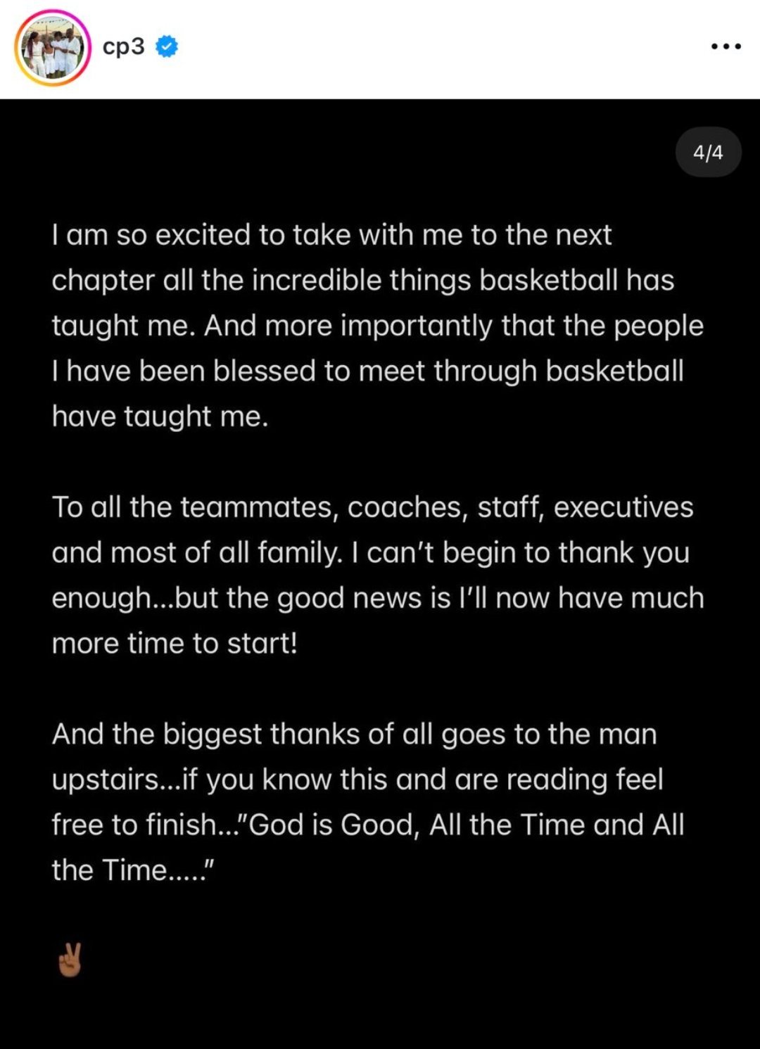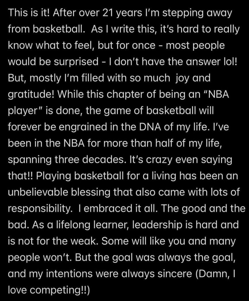我无比兴奋能将篮球教会我的所有不可思议的东西,都带到我的人生的下一篇章,更重要的是,我能够通过篮球有幸拥有遇到的人们教会我的一切。致所有的队友、教练、工作人员、管理层,当然,最重要的是我的家人,我对你们的感激无以言表,好消息是,我现在将有更多的时间来开始新的生活,向你们表达谢意了。
