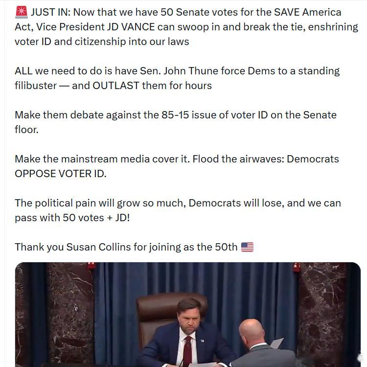《拯救美国法案》在参议院现在已经有50票支持,副总统JD·万斯可以介入打破平局,将选民身份证明和公民身份写入法律。